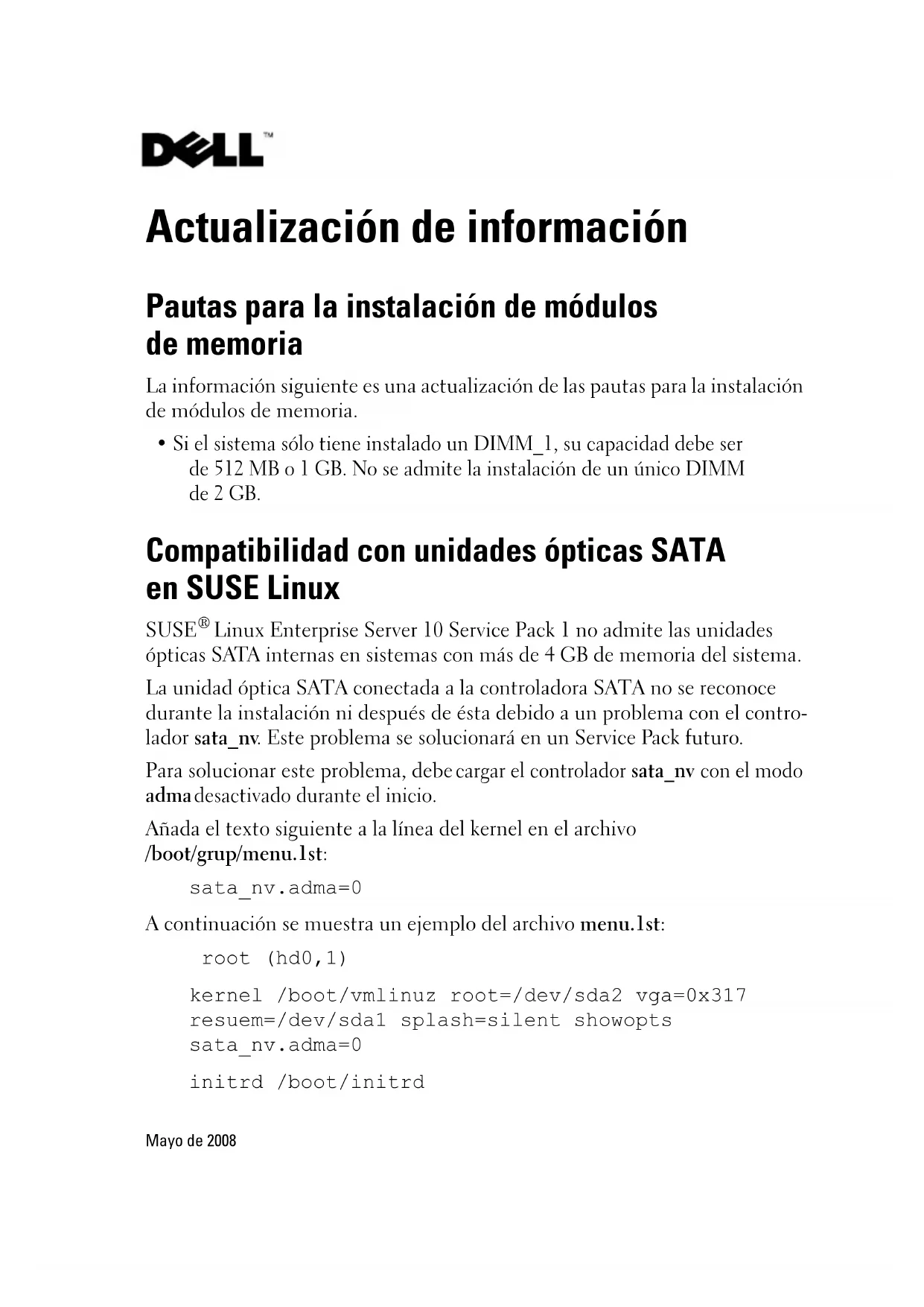 - Si el sistema sólo tiene instalado un DIMM_1, su capacidad debe ser de 512 MB o 1 GB. No se admite la instalación de un único DIMM de 2 GB. Compatibilidad con unidades ópticas SATA en SUSE Linux SUSE