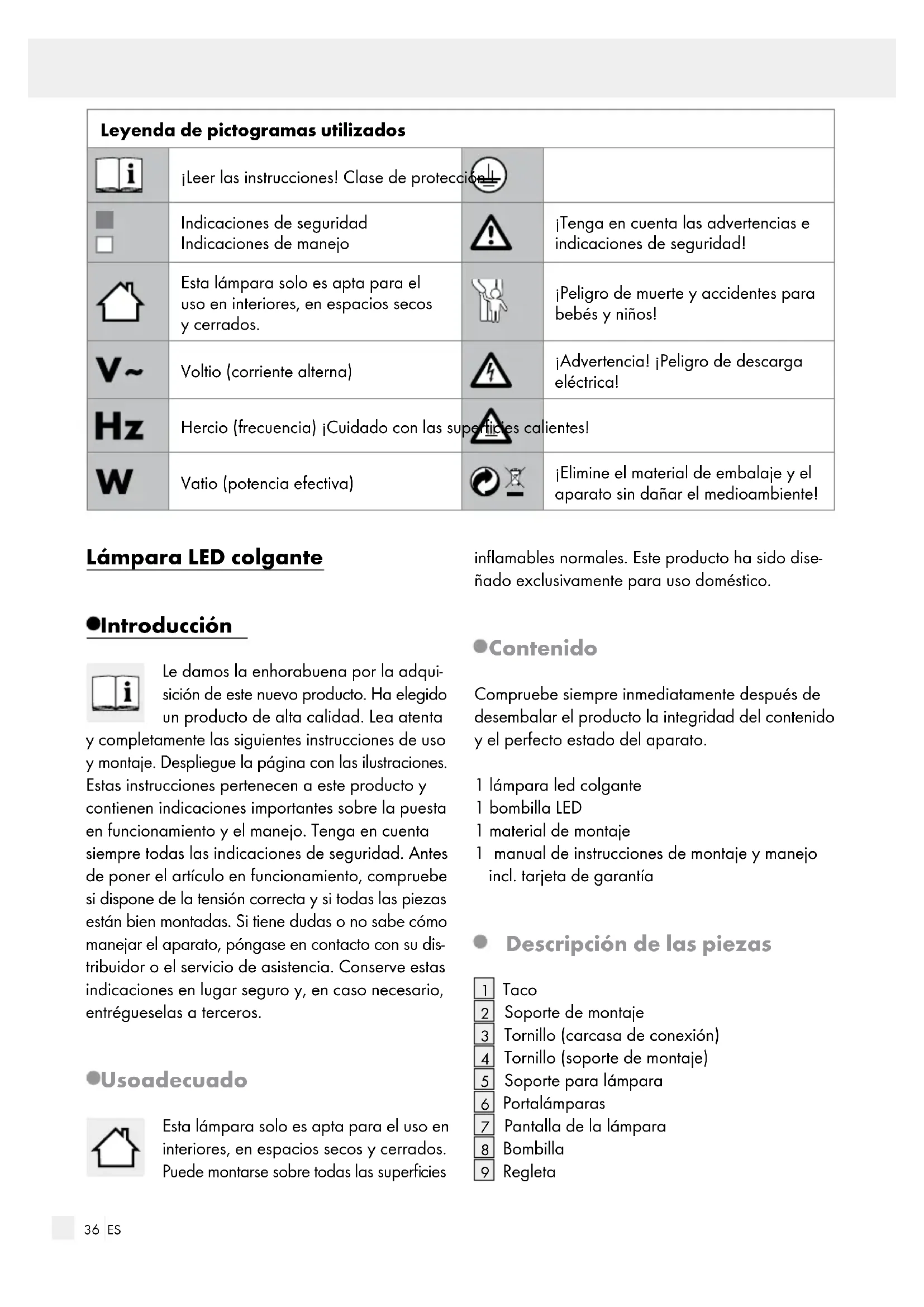 Estas instrucciones pertenecen a este producto y contienen indicaciones importantes sobre la puesta en funcionamiento y el manejo. Tenga en cuenta siempre todas las indicaciones de seguridad. Antes de poner el artículo en funcionamiento, compruebe si dispone de la tensión correcta y si todas las piezas están bien montadas. Si tiene dudas o no sabe cómo manejar el aparato, póngase en contacto con su dis- tribuidor o el servicio de asistencia. Conserve estas indicaciones en lugar seguro y, en caso necesario, entrégueselas a terceros. Uso adecuado Esta lámpara solo es apta para el uso en interiores, en espacios secos y cerrados. Puede montarse sobre todas las superfi cies inflamables normales. Este producto ha sido dise- ñado exclusivamente para uso doméstico. Contenido Compruebe siempre inmediatamente después de desembalar el producto la integridad del contenido y el perfecto estado del aparato. 1 lámpara led colgante 1 bombilla LED 1 material de montaje 1 manual de instrucciones de montaje y manejo incl. tarjeta de garantía Descripción de las piezas