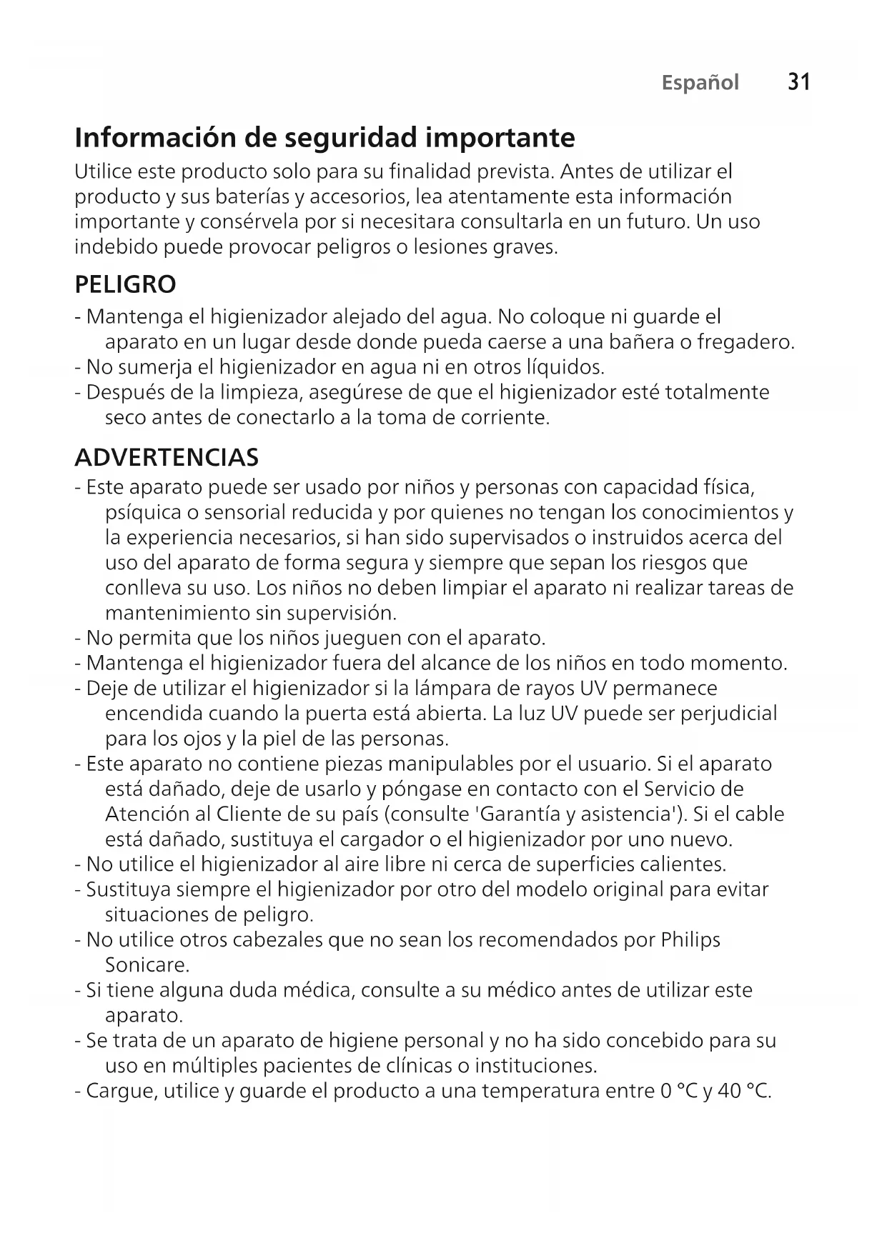 Español Información de seguridad importante Utilice este producto solo para su finalidad prevista. Antes de utilizar el producto y sus baterías y accesorios, lea atentamente esta información importante y consérvela por si necesitara consultarla en un futuro. Un uso indebido puede provocar peligros o lesiones graves. PELIGRO - Mantenga el higienizador alejado del agua. No coloque ni guarde el aparato en un lugar desde donde pueda caerse a una bañera o fregadero. - No sumerja el higienizador en agua ni en otros líquidos. - Después de la limpieza, asegúrese de que el higienizador esté totalmente seco antes de conectarlo a la toma de corriente. ADVERTENCIAS - Este aparato puede ser usado por niños y personas con capacidad física, psíquica o sensorial reducida y por quienes no tengan los conocimientos y la experiencia necesarios, si han sido supervisados o instruidos acerca del uso del aparato de forma segura y siempre que sepan los riesgos que conlleva su uso. Los niños no deben limpiar el aparato ni realizar tareas de mantenimiento sin supervisión. - No permita que los niños jueguen con el aparato. - Mantenga el higienizador fuera del alcance de los niños en todo momento. - Deje de utilizar el higienizador si la lámpara de rayos UV permanece encendida cuando la puerta está abierta. La luz UV puede ser perjudicial para los ojos y la piel de las personas. - Este aparato no contiene piezas manipulables por el usuario. Si el aparato está dañado, deje de usarlo y póngase en contacto con el Servicio de Atención al Cliente de su país (consulte 'Garantía y asistencia'). Si el cable está dañado, sustituya el cargador o el higienizador por uno nuevo. - No utilice el higienizador al aire libre ni cerca de superficies calientes. - Sustituya siempre el higienizador por otro del modelo original para evitar situaciones de peligro. - No utilice otros cabezales que no sean los recomendados por Philips Sonicare. - Si tiene alguna duda médica, consulte a su médico antes de utilizar este aparato. - Se trata de un aparato de higiene personal y no ha sido concebido para su uso en múltiples pacientes de clínicas o instituciones. - Cargue, utilice y guarde el producto a una temperatura entre 0°C y 40°C.32 Español ADVERTENCIA - Utilice el higienizador únicamente con la pantalla protectora colocada en su lugar. - La lámpara de rayos UV del higienizador está caliente durante el ciclo de higienización y justo después de él. No toque la lámpara de rayos UV cuando está caliente. - Si ha utilizado el higienizador durante 3 ciclos de limpieza por rayos UV consecutivos, apáguelo durante al menos 30 minutos antes de comenzar un nuevo ciclo de limpieza por rayos UV. - No lave ninguna pieza del producto en el lavavajillas. Campos electromagnéticos (CEM) Este aparato Philips cumple los estándares y las normativas aplicables sobre exposición a campos electromagnéticos. Introducción Enhorabuena por la adquisición de este producto, y bienvenido a Philips. Para sacar el mayor partido a la asistencia que Philips le ofrece, registre el producto en www.philips.com/welcome. Descripción general (Fig. 1) 1 Botón de encendido/apagado 2 Orificio de la puerta 3 Ventanilla 4 Cargador del cepillo de dientes eléctrico Sonicare 5 Cable Higienizado de los cabezales de cepillado Con el higienizador por rayos UV puede limpiar el cabezal del cepillo después de cada uso. Nota: La luz UV puede ser perjudicial para los ojos y la piel de las personas.