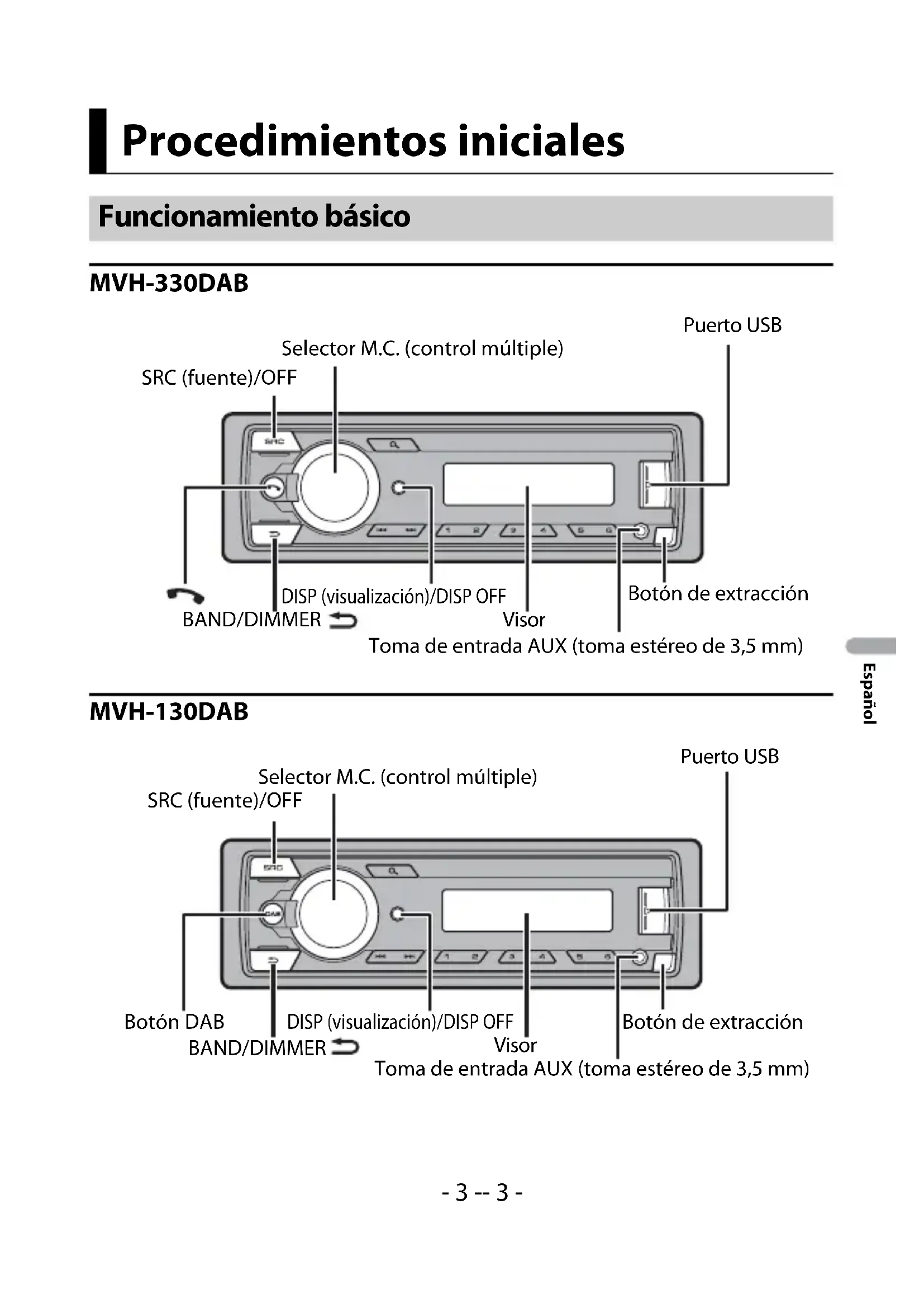 - En las siguientes instrucciones, la designación “dispositivo USB” hace referencia tanto a dispositivos de memoria USB como a reproductores de audio USB. Índice- 3 -- 3 - Español MVH-330DAB MVH-130DAB Procedimientos iniciales Funcionamiento básico SRC (fuente)/OFF Puerto USB Selector M.C. (control múltiple) BAND/DIMMER Visor DISP (visualización)/DISP OFF Botón de extracción Toma de entrada AUX (toma estéreo de 3,5 mm) SRC (fuente)/OFF Botón de extracción Visor Selector M.C. (control múltiple) BAND/DIMMER DISP (visualización)/DISP OFF Botón DAB Toma de entrada AUX (toma estéreo de 3,5 mm) Puerto USB- 4 - Español Operaciones más frecuentes Los botones disponibles varían en función de la unidad.