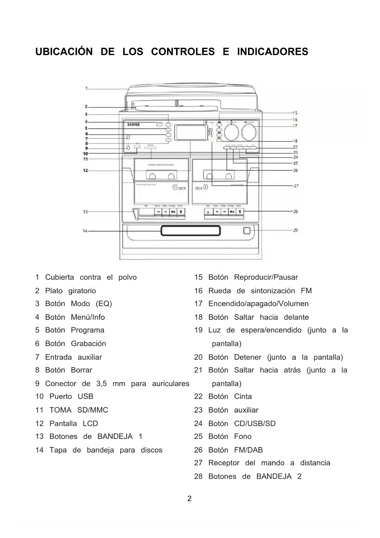 Centro de música MRD-166 con dos altavoces externos Manual de funcionamiento e instrucciones2 UBICACIÓN DE LOS CONTROLES E INDICADORES 1 Cubierta contra el polvo 2 Plato giratorio 3 Botón Modo (EQ) 4 Botón Menú/Info 5 Botón Programa 6 Botón Grabación 7 Entrada auxiliar 8 Botón Borrar 9 Conector de 3,5 mm para auriculares 10 Puerto USB