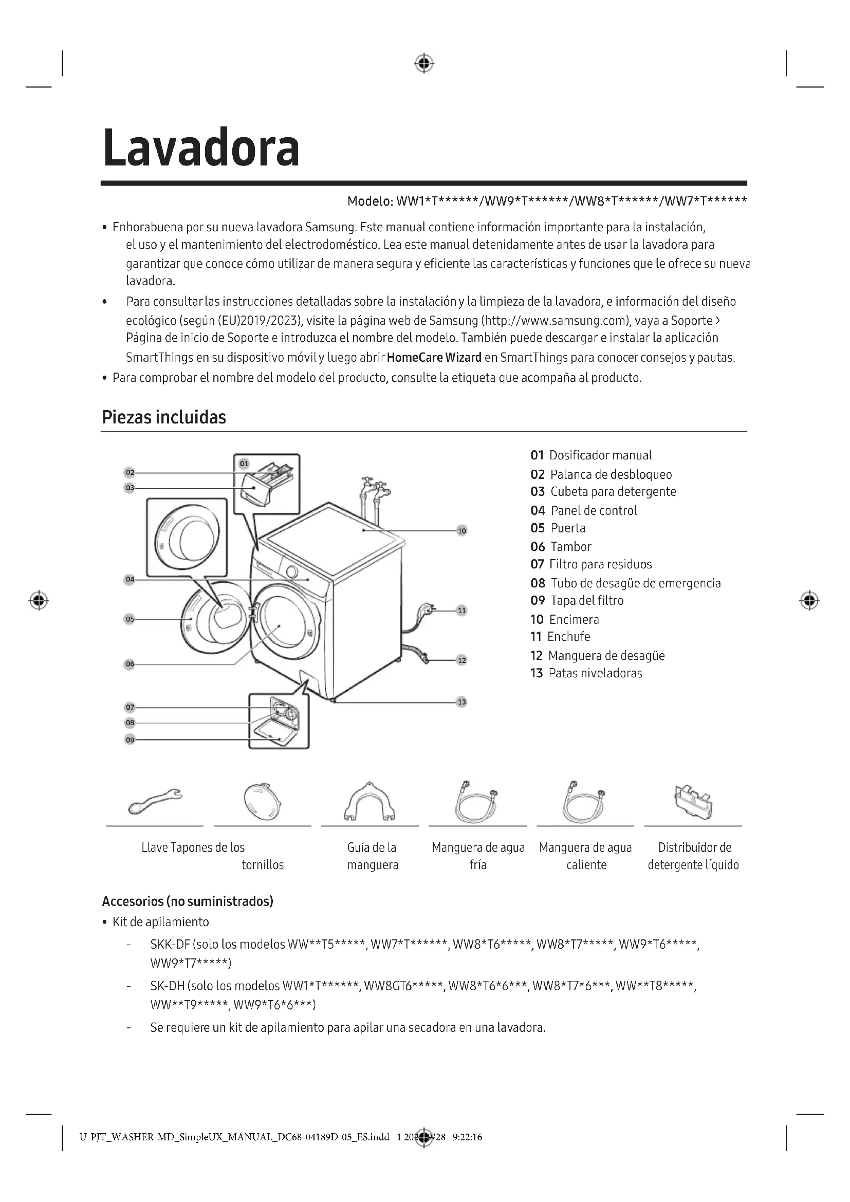 - Para consultar las instrucciones detalladas sobre la instalación y la limpieza de la lavadora, e información del diseño ecológico (según (EU)2019/2023), visite la página web de Samsung (http://www.samsung.com), vaya a Soporte > Página de inicio de Soporte e introduzca el nombre del modelo. También puede descargar e instalar la aplicación SmartThings en su dispositivo móvil y luego abrir HomeCare Wizard en SmartThings para conocer consejos y pautas.