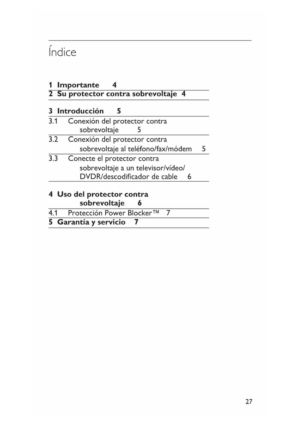 1 Importante 4 2 Su protector contra sobrevoltaje 4 3 Introducción 5