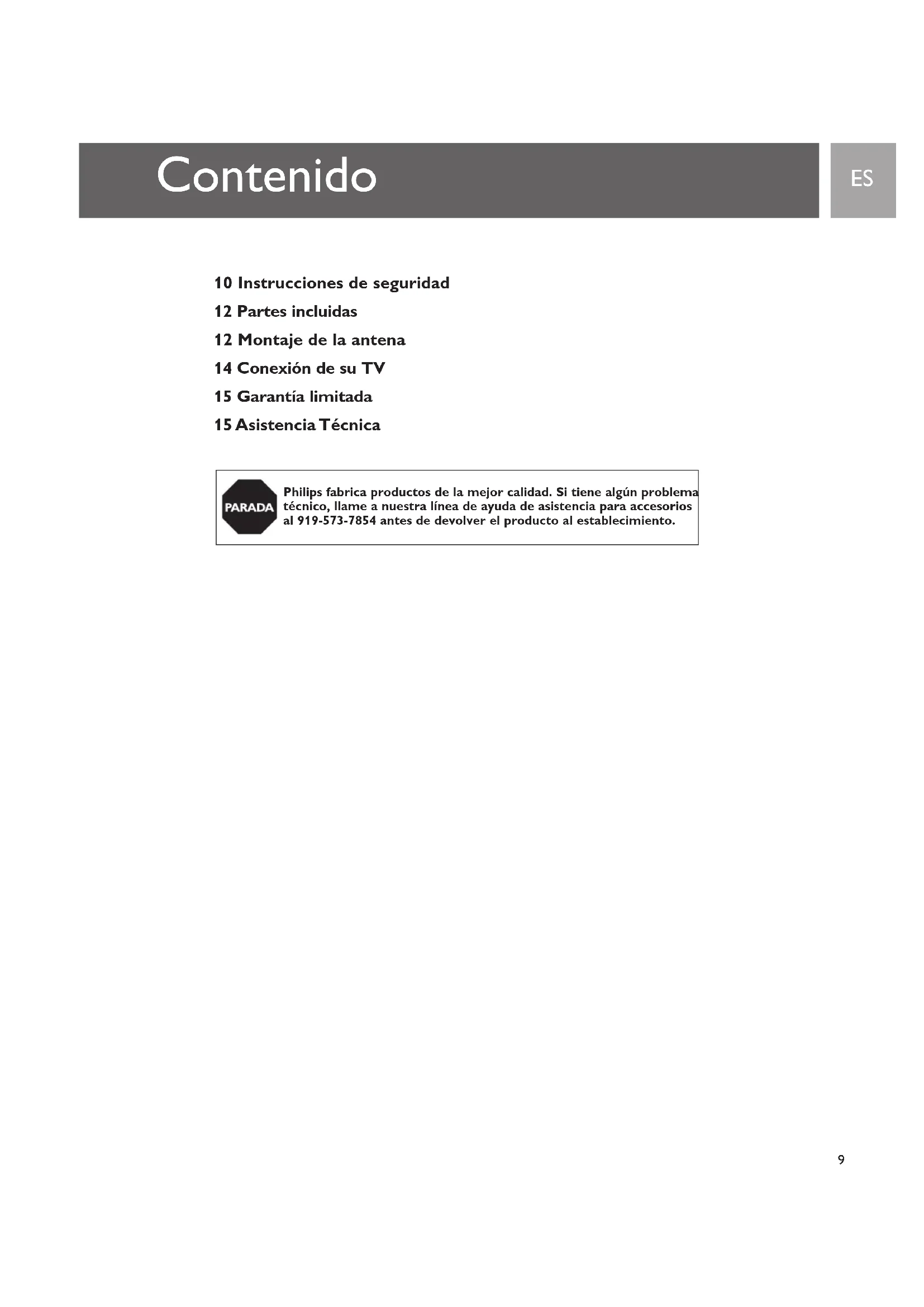 Technical Support Technical Support For Technical support send an email with the model number of the product and a detailed description of your problem to: Email: accessorysupport@philips.com Quality assured in USA Printed in China9 Contenido 10 Instrucciones de seguridad 12 Partes incluidas 12 Montaje de la antena 14 Conexión de su TV 15 Garantía limitada 15 Asistencia Técnica Philips fabrica productos de la mejor calidad. Si tiene algún problema técnico, llame a nuestra línea de ayuda de asistencia para accesorios al 919-573-7854 antes de devolver el producto al establecimiento. ES10