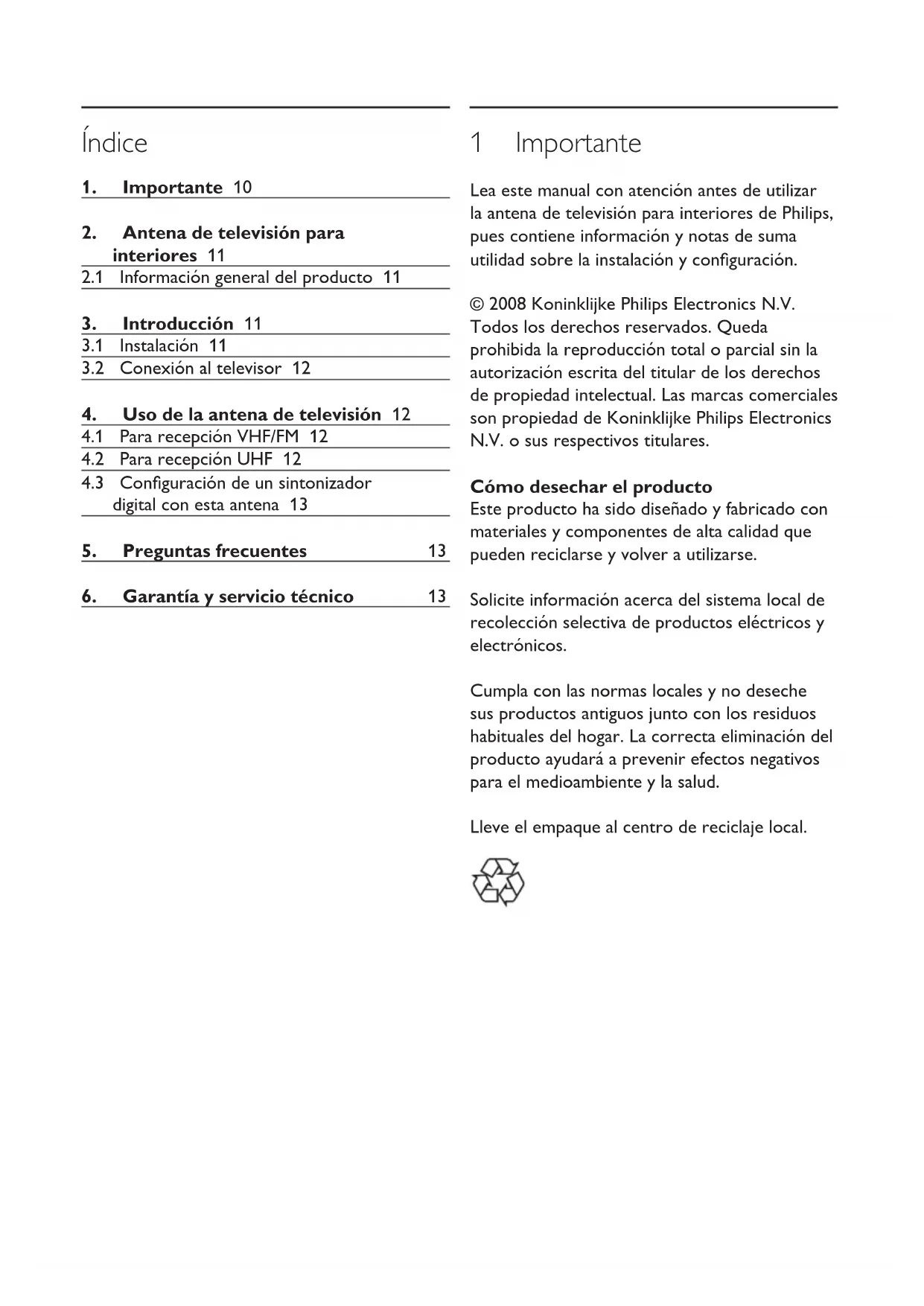 1 Importante Lea este manual con atención antes de utilizar la antena de televisión para interiores de Philips, pues contiene información y notas de suma utilidad sobre la instalación y conguración. © 2008 Koninklijke Philips Electronics N.V. Todos los derechos reservados. Queda prohibida la reproducción total o parcial sin la autorización escrita del titular de los derechos de propiedad intelectual. Las marcas comerciales son propiedad de Koninklijke Philips Electronics N.V. o sus respectivos titulares. Cómo desechar el producto Este producto ha sido diseñado y fabricado con materiales y componentes de alta calidad que pueden reciclarse y volver a utilizarse. Solicite información acerca del sistema local de recolección selectiva de productos eléctricos y electrónicos. Cumpla con las normas locales y no deseche sus productos antiguos junto con los residuos habituales del hogar. La correcta eliminación del producto ayudará a prevenir efectos negativos para el medioambiente y la salud. Lleve el empaque al centro de reciclaje local.11 2 Antena de televisión para interiores Felicitaciones por su compra y bienvenido a Philips. Para utilizar los servicios de asistencia técnica de Philips, registre su producto en www.philips.com/welcome.