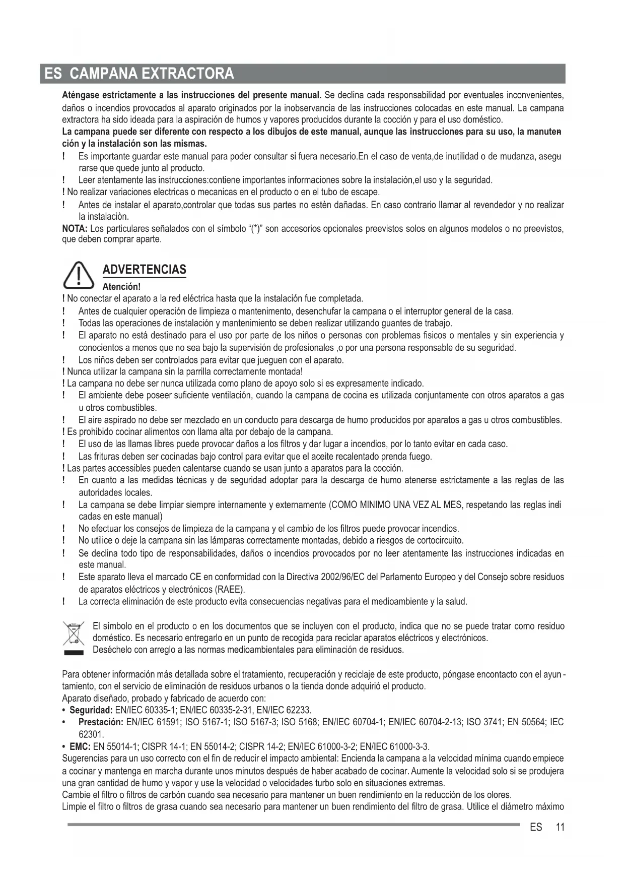 Aténgase estrictamente a las instrucciones del presente manual. Se declina cada responsabilidad por eventuales inconvenientes, daños o incendios provocados al aparato originados por la inobservancia de las instrucciones colocadas en este manual. La campana extractora ha sido ideada para la aspiración de humos y vapores producidos durante la cocción y para el uso doméstico. La campana puede ser diferente con respecto a los dibujos de este manual, aunque las instrucciones para su uso, la manuten- ción y la instalación son las mismas. ! Es importante guardar este manual para poder consultar si fuera necesario.En el caso de venta,de inutilidad o de mudanza, asegu- rarse que quede junto al producto. ! Leer atentamente las instrucciones:contiene importantes informaciones sobre la instalación,el uso y la seguridad. ! No realizar variaciones electricas o mecanicas en el producto o en el tubo de escape. ! Antes de instalar el aparato,controlar que todas sus partes no estèn dañadas. En caso contrario llamar al revendedor y no realizar la instalaciòn. NOTA: Los particulares señalados con el símbolo “(*)” son accesorios opcionales preevistos solos en algunos modelos o no preevistos, que deben comprar aparte. ADVERTENCIAS Atención! ! No conectar el aparato a la red eléctrica hasta que la instalación fue completada. ! Antes de cualquier operación de limpieza o mantenimento, desenchufar la campana o el interruptor general de la casa. ! Todas las operaciones de instalación y mantenimiento se deben realizar utilizando guantes de trabajo. ! El aparato no está destinado para el uso por parte de los niños o personas con problemas fisicos o mentales y sin experiencia y conocientos a menos que no sea bajo la supervisión de profesionales ,o por una persona responsable de su seguridad. ! Los niños deben ser controlados para evitar que jueguen con el aparato. ! Nunca utilizar la campana sin la parrilla correctamente montada! ! La campana no debe ser nunca utilizada como plano de apoyo solo si es expresamente indicado. ! El ambiente debe poseer suficiente ventilación, cuando la campana de cocina es utilizada conjuntamente con otros aparatos a gas u otros combustibles. ! El aire aspirado no debe ser mezclado en un conducto para descarga de humo producidos por aparatos a gas u otros combustibles. ! Es prohibido cocinar alimentos con llama alta por debajo de la campana. ! El uso de las llamas libres puede provocar daños a los filtros y dar lugar a incendios, por lo tanto evitar en cada caso. ! Las frituras deben ser cocinadas bajo control para evitar que el aceite recalentado prenda fuego. ! Las partes accessibles pueden calentarse cuando se usan junto a aparatos para la cocción. ! En cuanto a las medidas técnicas y de seguridad adoptar para la descarga de humo atenerse estrictamente a las reglas de las autoridades locales. ! La campana se debe limpiar siempre internamente y externamente (COMO MINIMO UNA VEZ AL MES, respetando las reglas indi- cadas en este manual) ! No efectuar los consejos de limpieza de la campana y el cambio de los filtros puede provocar incendios. ! No utilice o deje la campana sin las lámparas correctamente montadas, debido a riesgos de cortocircuito. ! Se declina todo tipo de responsabilidades, daños o incendios provocados por no leer atentamente las instrucciones indicadas en este manual. ! Este aparato lleva el marcado CE en conformidad con la Directiva 2002/96/EC del Parlamento Europeo y del Consejo sobre residuos de aparatos eléctricos y electrónicos (RAEE). ! La correcta eliminación de este producto evita consecuencias negativas para el medioambiente y la salud. El símbolo en el producto o en los documentos que se incluyen con el producto, indica que no se puede tratar como residuo doméstico. Es necesario entregarlo en un punto de recogida para reciclar aparatos eléctricos y electrónicos. Deséchelo con arreglo a las normas medioambientales para eliminación de residuos. Para obtener información más detallada sobre el tratamiento, recuperación y reciclaje de este producto, póngase encontacto con el ayun - tamiento, con el servicio de eliminación de residuos urbanos o la tienda donde adquirió el producto. Aparato diseñado, probado y fabricado de acuerdo con: