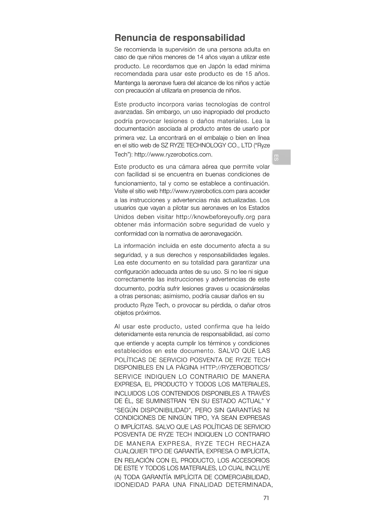 Renuncia de responsabilidad Se recomienda la supervisión de una persona adulta en caso de que niños menores de 14 años vayan a utilizar este producto. Le recordamos que en Japón la edad mínima recomendada para usar este producto es de 15 años. Mantenga la aeronave fuera del alcance de los niños y actúe con precaución al utilizarla en presencia de niños. Este producto incorpora varias tecnologías de control avanzadas. Sin embargo, un uso inapropiado del producto podría provocar lesiones o daños materiales. Lea la documentación asociada al producto antes de usarlo por primera vez. La encontrará en el embalaje o bien en línea en el sitio web de SZ RYZE TECHNOLOGY CO., LTD (“Ryze Tech”): http://www.ryzerobotics.com. Este producto es una cámara aérea que permite volar con facilidad si se encuentra en buenas condiciones de funcionamiento, tal y como se establece a continuación. Visite el sitio web http://www.ryzerobotics.com para acceder a las instrucciones y advertencias más actualizadas. Los usuarios que vayan a pilotar sus aeronaves en los Estados Unidos deben visitar http://knowbeforeyoufly.org para obtener más información sobre seguridad de vuelo y conformidad con la normativa de aeronavegación. La información incluida en este documento afecta a su seguridad, y a sus derechos y responsabilidades legales. Lea este documento en su totalidad para garantizar una conguración adecuada antes de su uso. Si no lee ni sigue correctamente las instrucciones y advertencias de este documento, podría sufrir lesiones graves u ocasionárselas a otras personas; asimismo, podría causar daños en su producto Ryze Tech, o provocar su pérdida, o dañar otros objetos próximos. Al usar este producto, usted confirma que ha leído detenidamente esta renuncia de responsabilidad, así como que entiende y acepta cumplir los términos y condiciones establecidos en este documento. SALVO QUE LAS POLÍTICAS DE SERVICIO POSVENTA DE RYZE TECH DISPONIBLES EN LA PÁGINA HTTP://RYZEROBOTICS/