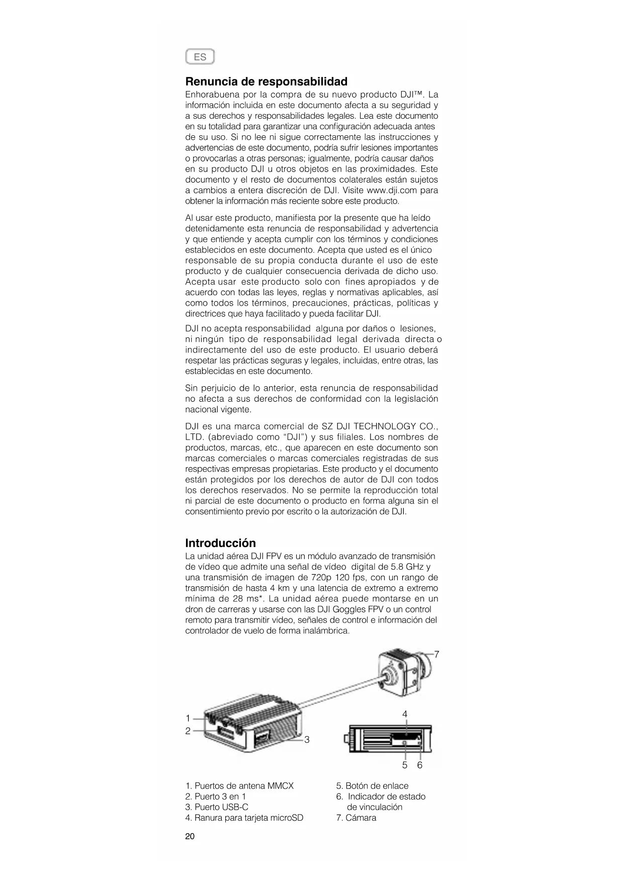 Renuncia de responsabilidad Enhorabuena por la compra de su nuevo producto DJI™. La información incluida en este documento afecta a su seguridad y a sus derechos y responsabilidades legales. Lea este documento en su totalidad para garantizar una conguración adecuada antes de su uso. Si no lee ni sigue correctamente las instrucciones y advertencias de este documento, podría sufrir lesiones importantes o provocarlas a otras personas; igualmente, podría causar daños en su producto DJI u otros objetos en las proximidades. Este documento y el resto de documentos colaterales están sujetos a cambios a entera discreción de DJI. Visite www.dji.com para obtener la información más reciente sobre este producto. Al usar este producto, maniesta por la presente que ha leído detenidamente esta renuncia de responsabilidad y advertencia y que entiende y acepta cumplir con los términos y condiciones establecidos en este documento. Acepta que usted es el único responsable de su propia conducta durante el uso de este producto y de cualquier consecuencia derivada de dicho uso. Acepta usar este producto solo con fines apropiados y de acuerdo con todas las leyes, reglas y normativas aplicables, así como todos los términos, precauciones, prácticas, políticas y directrices que haya facilitado y pueda facilitar DJI. DJI no acepta responsabilidad alguna por daños o lesiones, ni ningún tipo de responsabilidad legal derivada directa o indirectamente del uso de este producto. El usuario deberá respetar las prácticas seguras y legales, incluidas, entre otras, las establecidas en este documento. Sin perjuicio de lo anterior, esta renuncia de responsabilidad no afecta a sus derechos de conformidad con la legislación nacional vigente. DJI es una marca comercial de SZ DJI TECHNOLOGY CO., LTD. (abreviado como “DJI”) y sus filiales. Los nombres de productos, marcas, etc., que aparecen en este documento son marcas comerciales o marcas comerciales registradas de sus respectivas empresas propietarias. Este producto y el documento están protegidos por los derechos de autor de DJI con todos los derechos reservados. No se permite la reproducción total ni parcial de este documento o producto en forma alguna sin el consentimiento previo por escrito o la autorización de DJI. Introducción La unidad aérea DJI FPV es un módulo avanzado de transmisión de vídeo que admite una señal de vídeo digital de 5.8 GHz y una transmisión de imagen de 720p 120 fps, con un rango de transmisión de hasta 4 km y una latencia de extremo a extremo mínima de 28 ms*. La unidad aérea puede montarse en un dron de carreras y usarse con las DJI Goggles FPV o un control remoto para transmitir vídeo, señales de control e información del controlador de vuelo de forma inalámbrica.