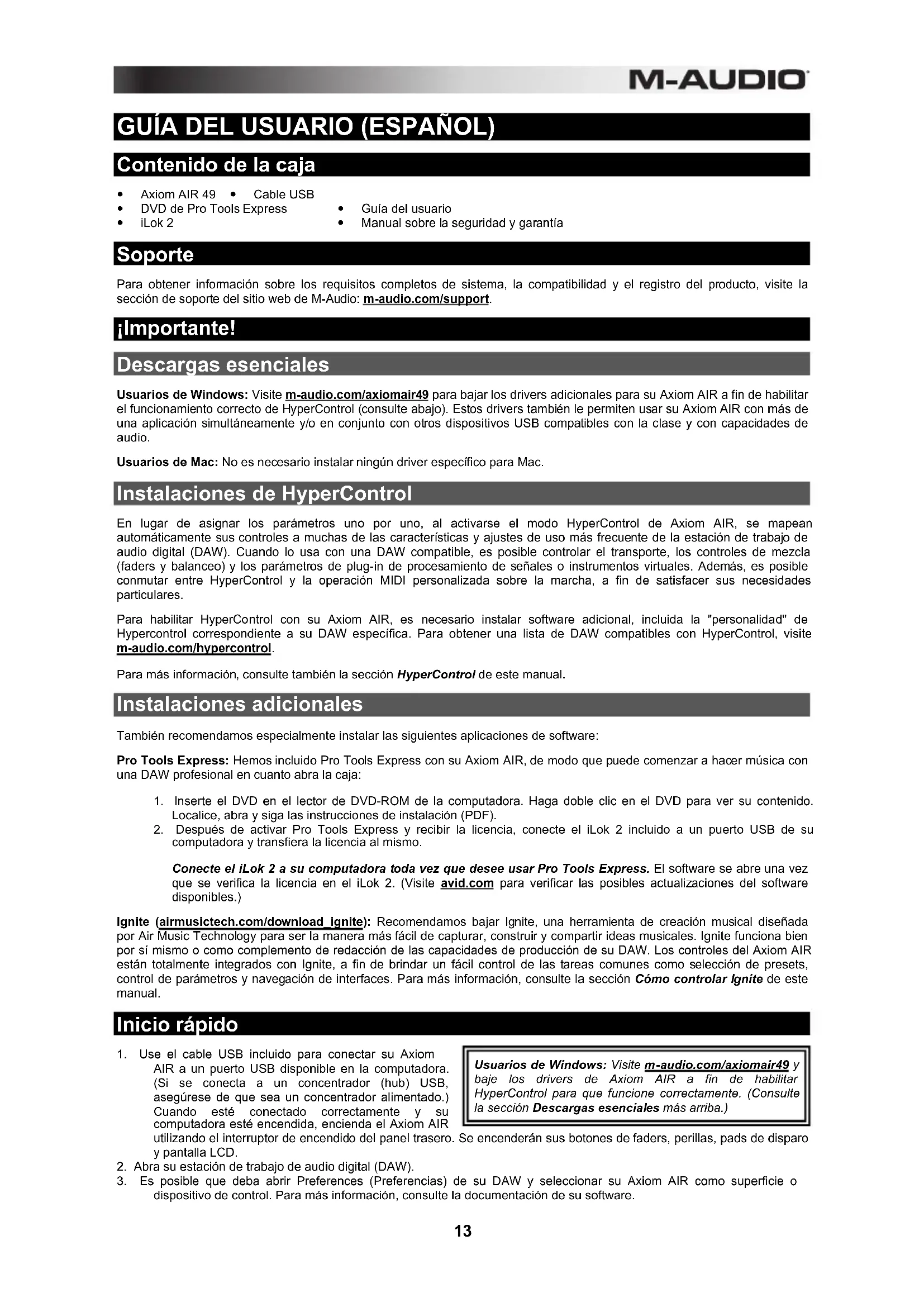 again. Controlling Ignite Ignite, included with your Axiom AIR, is a creative tool designed for rapid and fluid capture, refinement, and sharing of musical ideas. You can use it on its own or as a counterpart to your favorite DAW. To download Ignite, visit airmusictech.com/download_ignite. For more in-depth information on Ignite, please see the Ignite documentation. Axiom AIR keyboards come pre-configured to control Ignite through HyperControl. When you launch Ignite with your Axiom AIR connected to the computer, you can use Axiom AIR's controls in the following ways: Transport Controls Press the HyperControl Mix Mode button ( button) on the main control panel, and then use the transport buttons to control those transport functions in Ignite. Navigation Use the Directional buttons to navigate through Ignite's tabs and sub-menus, depending on the current control focus. Instruments Refer to your Ignite's HyperControl user guide (at m-audio.com/hypercontrol) to see which parameter is assigned to each control.13 GUÍA DEL USUARIO (ESPAÑOL) Contenido de la caja Axiom AIR 49 Cable USB DVD de Pro Tools Express Guía del usuario iLok 2 Manual sobre la seguridad y garantía Soporte Para obtener información sobre los requisitos completos de sistema, la compatibilidad y el registro del producto, visite la sección de soporte del sitio web de M-Audio: m-audio.com/support. ¡Importante! Descargas esenciales Usuarios de Windows: Visite m-audio.com/axiomair49 para bajar los drivers adicionales para su Axiom AIR a fin de habilitar el funcionamiento correcto de HyperControl (consulte abajo). Estos drivers también le permiten usar su Axiom AIR con más de una aplicación simultáneamente y/o en conjunto con otros dispositivos USB compatibles con la clase y con capacidades de audio. Usuarios de Mac: No es necesario instalar ningún driver específico para Mac. Instalaciones de HyperControl En lugar de asignar los parámetros uno por uno, al activarse el modo HyperControl de Axiom AIR, se mapean automáticamente sus controles a muchas de las características y ajustes de uso más frecuente de la estación de trabajo de audio digital (DAW). Cuando lo usa con una DAW compatible, es posible controlar el transporte, los controles de mezcla (faders y balanceo) y los parámetros de plug-in de procesamiento de señales o instrumentos virtuales. Además, es posible conmutar entre HyperControl y la operación MIDI personalizada sobre la marcha, a fin de satisfacer sus necesidades particulares. Para habilitar HyperControl con su Axiom AIR, es necesario instalar software adicional, incluida la "personalidad" de Hypercontrol correspondiente a su DAW específica. Para obtener una lista de DAW compatibles con HyperControl, visite m-audio.com/hypercontrol. Para más información, consulte también la sección HyperControl de este manual. Instalaciones adicionales También recomendamos especialmente instalar las siguientes aplicaciones de software: Pro Tools Express: Hemos incluido Pro Tools Express con su Axiom AIR, de modo que puede comenzar a hacer música con una DAW profesional en cuanto abra la caja: