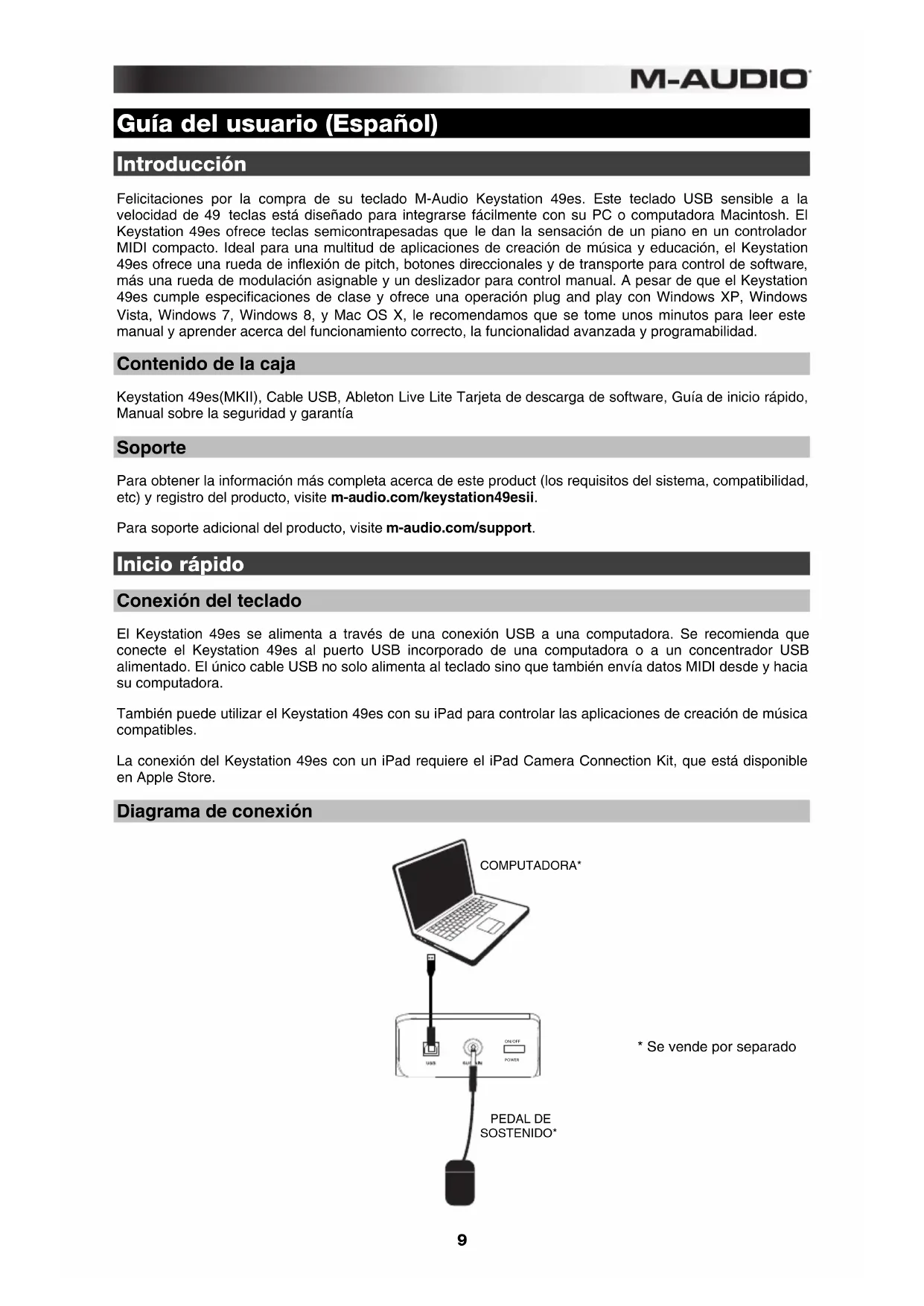 The Keyboard is now back to the factory default settings.9 ON/OFF ON/OFF POWER POWER Guía del usuario (Español) Introducción Felicitaciones por la compra de su teclado M-Audio Keystation 49es. Este teclado USB sensible a la velocidad de 49 teclas está diseñado para integrarse fácilmente con su PC o computadora Macintosh. El Keystation 49es ofrece teclas semicontrapesadas que le dan la sensación de un piano en un controlador MIDI compacto. Ideal para una multitud de aplicaciones de creación de música y educación, el Keystation 49es ofrece una rueda de inflexión de pitch, botones direccionales y de transporte para control de software, más una rueda de modulación asignable y un deslizador para control manual. A pesar de que el Keystation 49es cumple especificaciones de clase y ofrece una operación plug and play con Windows XP, Windows Vista, Windows 7, Windows 8, y Mac OS X, le recomendamos que se tome unos minutos para leer este manual y aprender acerca del funcionamiento correcto, la funcionalidad avanzada y programabilidad. Contenido de la caja Keystation 49es(MKII), Cable USB, Ableton Live Lite Tarjeta de descarga de software, Guía de inicio rápido, Manual sobre la seguridad y garantía Soporte Para obtener la información más completa acerca de este product (los requisitos del sistema, compatibilidad, etc) y registro del producto, visite m-audio.com/keystation49esii. Para soporte adicional del producto, visite m-audio.com/support. Inicio rápido Conexión del teclado El Keystation 49es se alimenta a través de una conexión USB a una computadora. Se recomienda que conecte el Keystation 49es al puerto USB incorporado de una computadora o a un concentrador USB alimentado. El único cable USB no solo alimenta al teclado sino que también envía datos MIDI desde y hacia su computadora. También puede utilizar el Keystation 49es con su iPad para controlar las aplicaciones de creación de música compatibles. La conexión del Keystation 49es con un iPad requiere el iPad Camera Connection Kit, que está disponible en Apple Store. Diagrama de conexión
