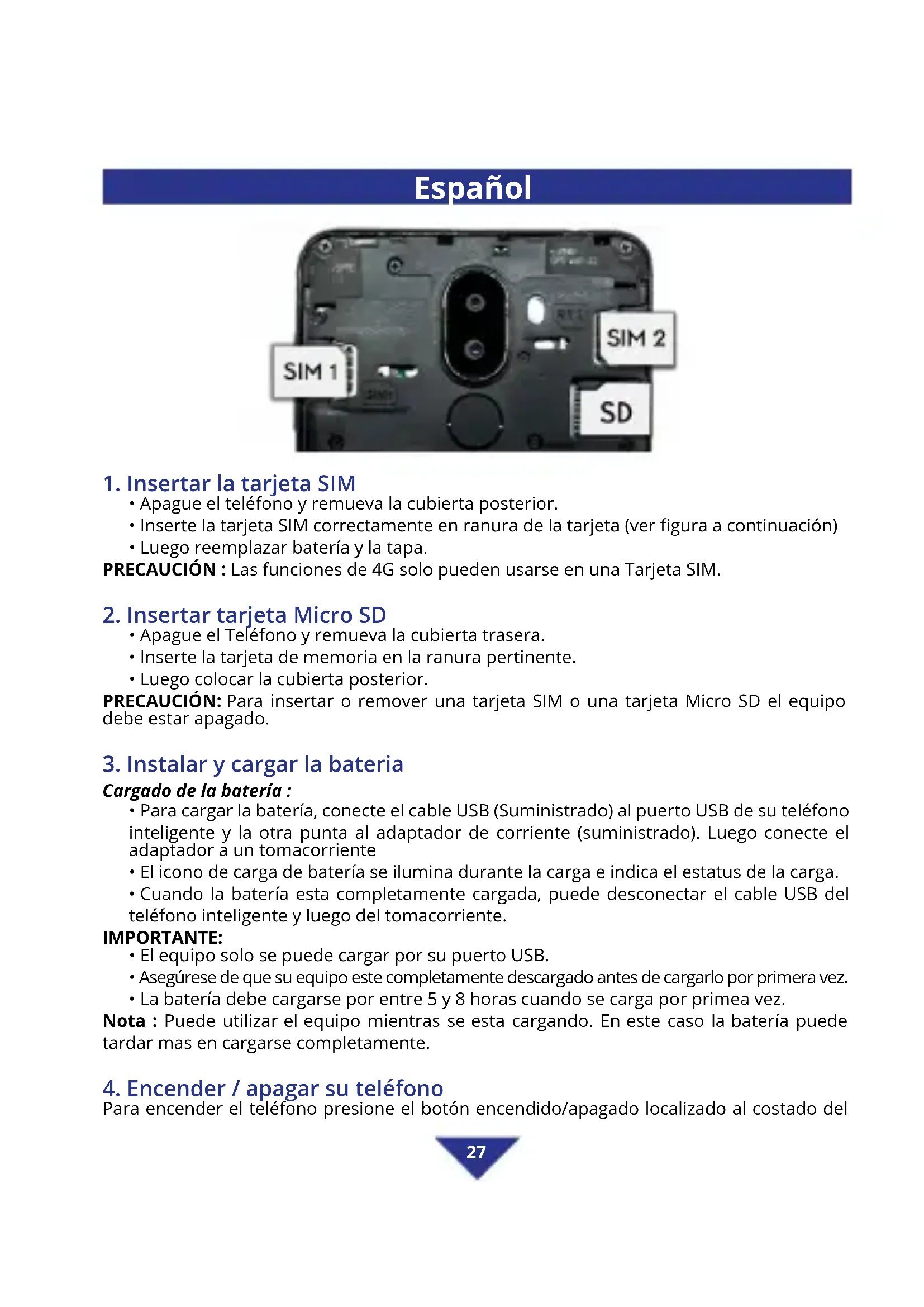 - Luego reemplazar batería y la tapa. PRECAUCIÓN : Las funciones de 4G solo pueden usarse en una Tarjeta SIM.