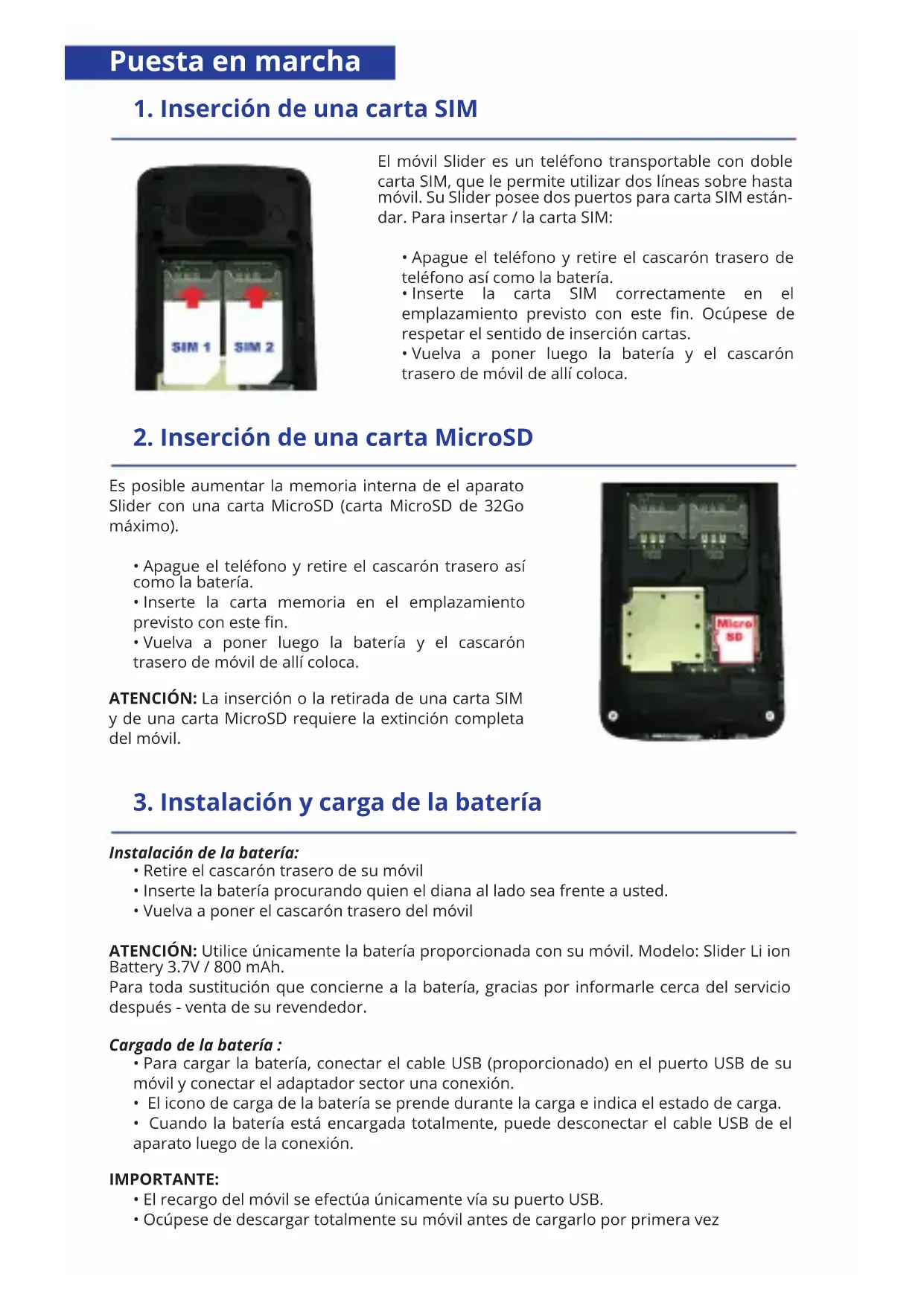 - Vuelva a poner luego la batería y el cascarón trasero de móvil de allí coloca. Puesta en marcha Es posible aumentar la memoria interna de el aparato Slider con una carta MicroSD (carta MicroSD de 32Go máximo).