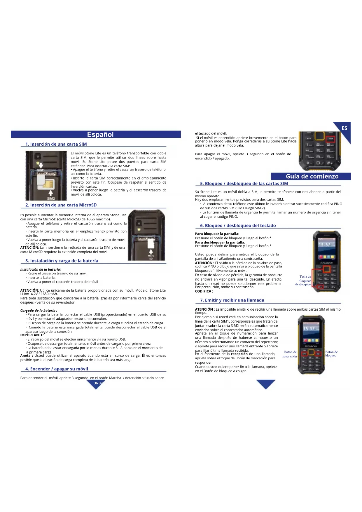 Konrow le agradece De haber escogido el móvil Stone Lite. Usted encontrará en este guía todas las informaciones relativas a la utilización de este teléfono móvil. ADVERTENCIA: