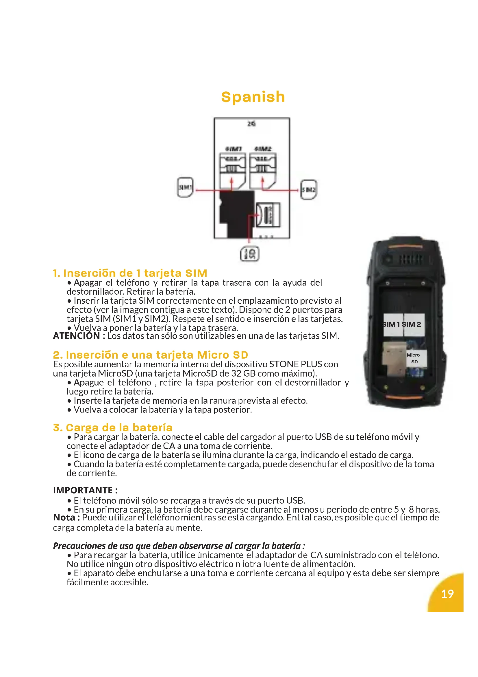Su STONE PLUS es un móvil con doble SIM, que le permite realizar llamadas con dos números de abonado desde el mismo dispositivo. Hay dos ranuras para dos tarjetas SIM. Cuando su teléfono móvil se inicie, le pedirá que introduzca el código PIN de sus dos tarjetas SIM una detrás de otra. (SIM1 y luego SIM 2)
