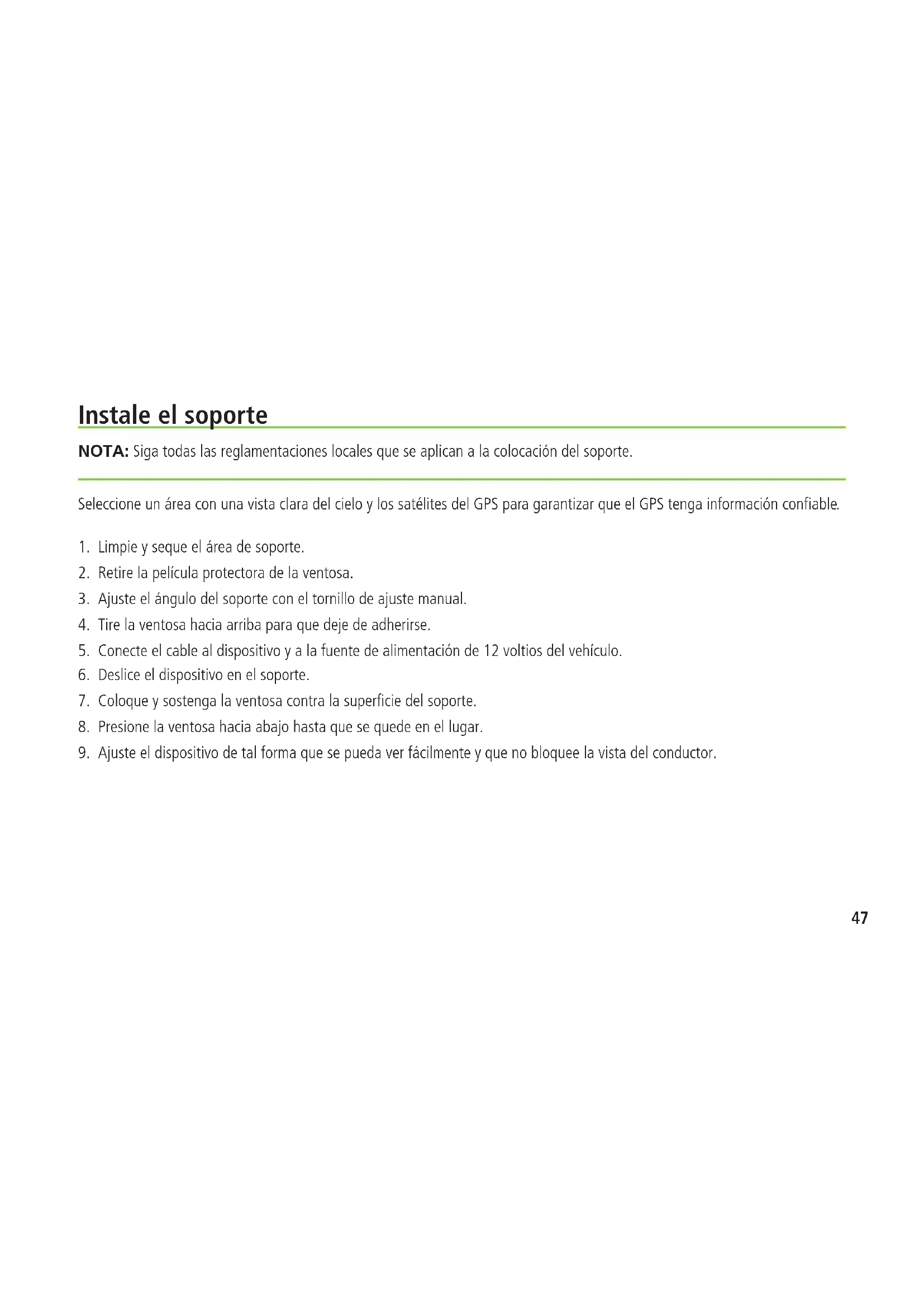 9. Ajuste el dispositivo de tal forma que se pueda ver fácilmente y que no bloquee la vista del conductor.