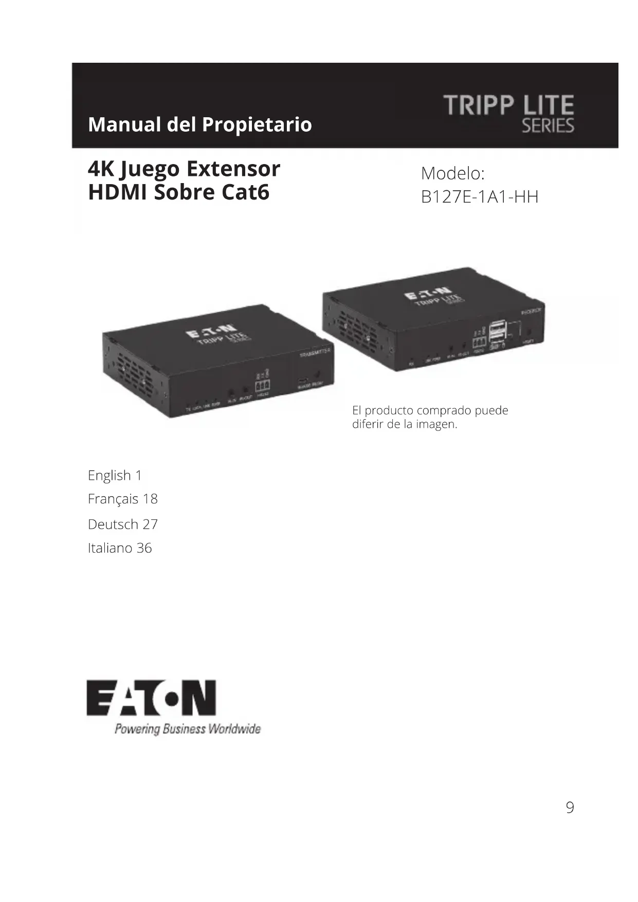 - Devolver el equipo nuevo para nes de reciclaje una vez que nalmente se convierta en residuo ADVERTENCIA No se recomienda el uso de este equipo en aplicaciones de soporte de vida en donde razonablemente se pueda esperar que la falla de este equipo cause la falla del equipo de soporte de vida o afectar signicativamente su seguridad o efectividad. Eaton tiene una política de mejora continua. Las especicaciones están sujetas a cambio sin previo aviso. Garantía Eaton 1000 Eaton Boulevard Cleveland, OH 44122 Estados Unidos Eaton.com © 2024 Eaton Todos los derechos reservados Publicación No. 23-09-191 / 93-3B89_RevB Febrero 2024 Eaton es una marca registrada. Todas las marcas registradas son propiedad de sus respectivos propietarios. 933B8918 Manuel d'utilisation Le produit acheté peut différer de l'image. Modèle: B127E-1A1-HH Kit de rallonge HDMI 4K sur Cat6 English 1 Español 9 Deutsch 27 Italiano 3619 Contenu du carton d'emballage