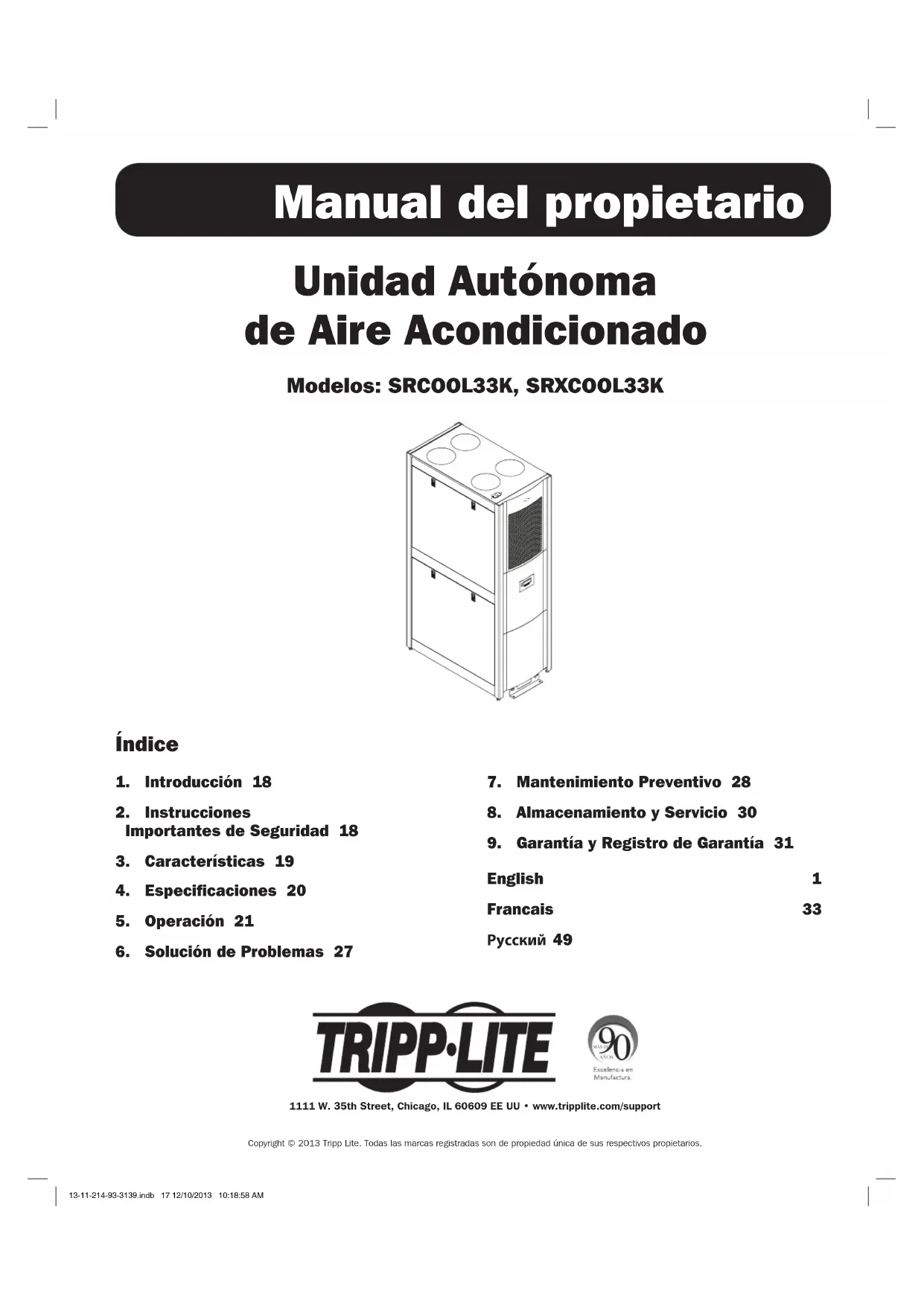 English 1 Francais 33 Русский 49 Unidad Autónoma de Aire Acondicionado Modelos: SRCOOL33K, SRXCOOL33K Manual del propietario 1111 W. 35th Street, Chicago, IL 60609 EE UU • www.tripplite.com/support MÁS DECopyright © 2013 Tripp Lite. Todas las marcas registradas son de propiedad única de sus respectivos propietarios.13-11-214-93-3139.indb 17 12/10/2013 10:18:58 AM1. Introducción