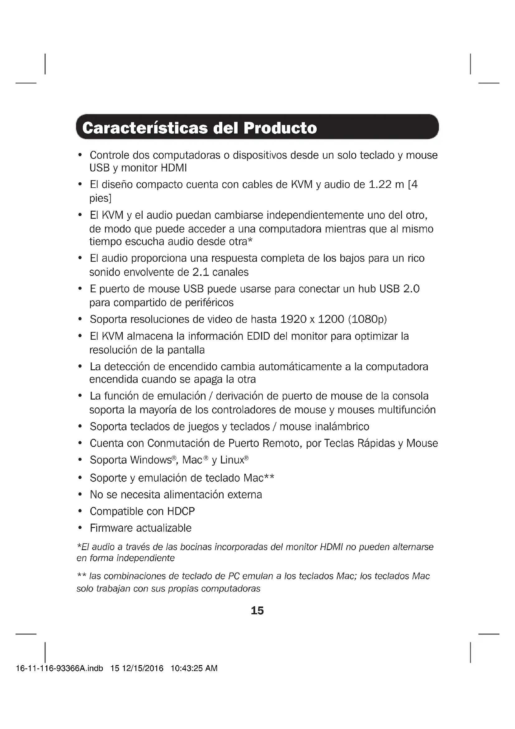 - Firmware actualizable *El audio a través de las bocinas incorporadas del monitor HDMI no pueden alternarse en forma independiente ** las combinaciones de teclado de PC emulan a los teclados Mac; los teclados Mac solo trabajan con sus propias computadoras 16-11-116-93366A.indb 15 12/15/2016 10:43:25 AM16 Accesorios Opcionales Requisitos del Sistema Contenido del Empaque