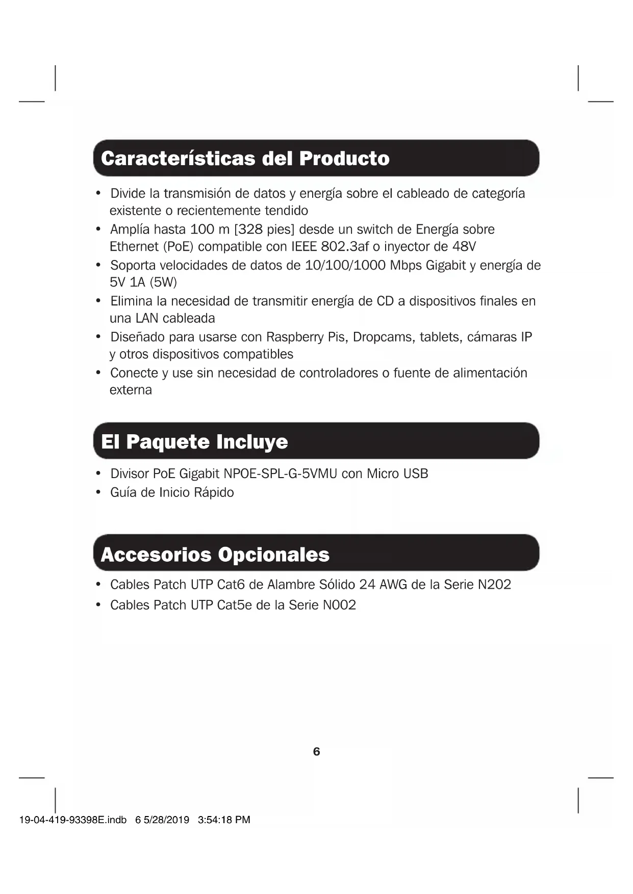 - Regresar el equipo nuevo para reciclaje una vez que finalmente sea un desecho No se recomienda el uso de este equipo en aplicaciones de soporte de vida en donde razonablemente se pueda esperar que la falla de este equipo cause la falla del equipo de soporte de vida o afectar significativamente su seguridad o efectividad.. Tripp Lite tiene una política de mejora continua. Las especificaciones están sujetas a cambio sin previo aviso. Las fotografías e ilustraciones pueden diferir ligeramente de los productos reales. 1111 W. 35th Street, Chicago, IL 60609 EE UU • www.tripplite.com/support 19-04-419 93-398E_RevA 19-04-419-93398E.indb 8 5/28/2019 3:54:19 PM9 Guide de démarrage rapide Coupleur actif PoE Gigabit IEEE 802.3af avec Micro USB, 48 V à 5 V 1 A Modèle : NPOE-SPL-G-5VMU 1111 W. 35th Street, Chicago, IL 60609 USA • www.tripplite.com/support Droits d'auteur © 2019 Tripp Lite. Tous droits réservés. English 1 • Español 5 • Русский 13 19-04-419-93398E.indb 9 5/28/2019 3:54:19 PM10 Caractéristiques du produit L'emballage inclut Accessoires en option