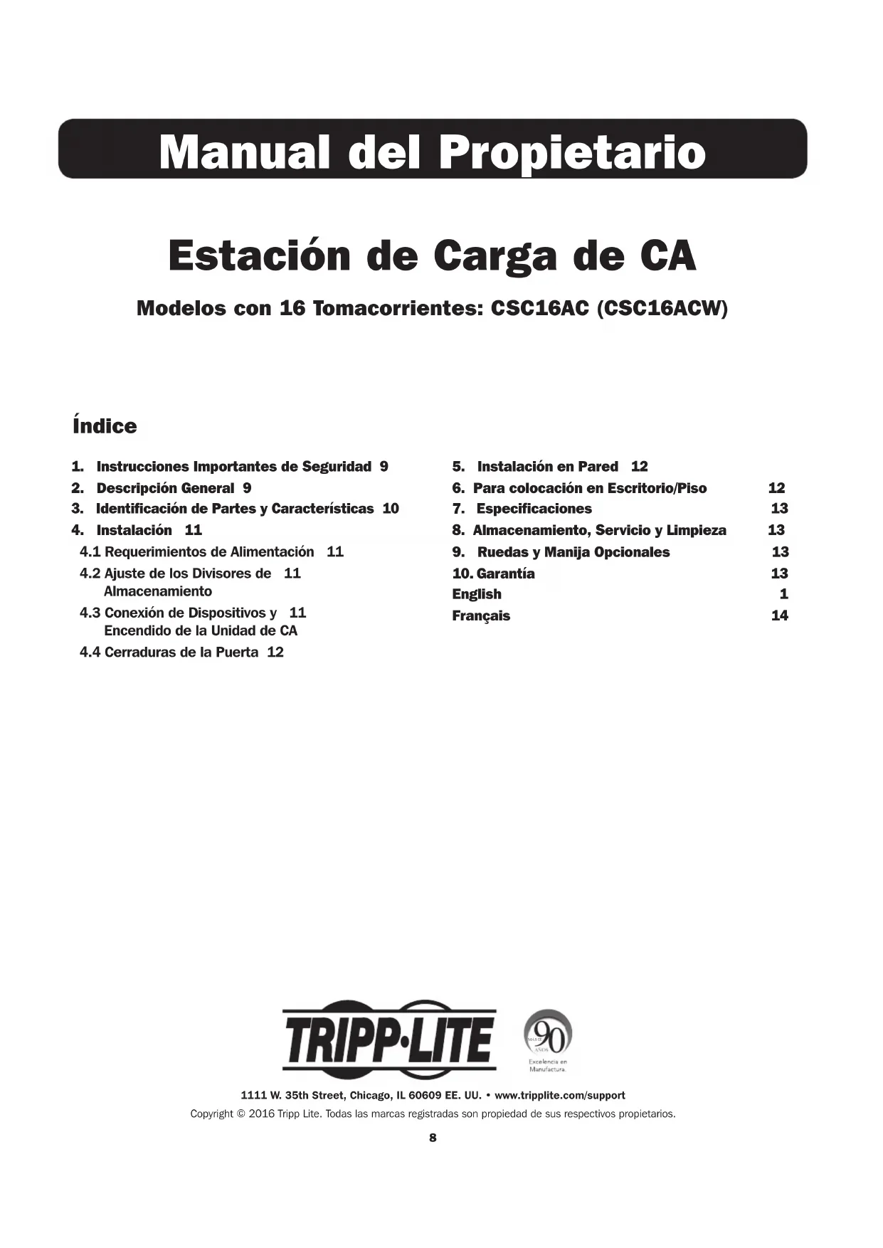 English 1 Français 14 Estación de Carga de CA Modelos con 16 Tomacorrientes: CSC16AC (CSC16ACW) Manual del Propietario 1111 W. 35th Street, Chicago, IL 60609 EE. UU. • www.tripplite.com/support Copyright © 2016 Tripp Lite. Todas las marcas registradas son propiedad de sus respectivos propietarios.