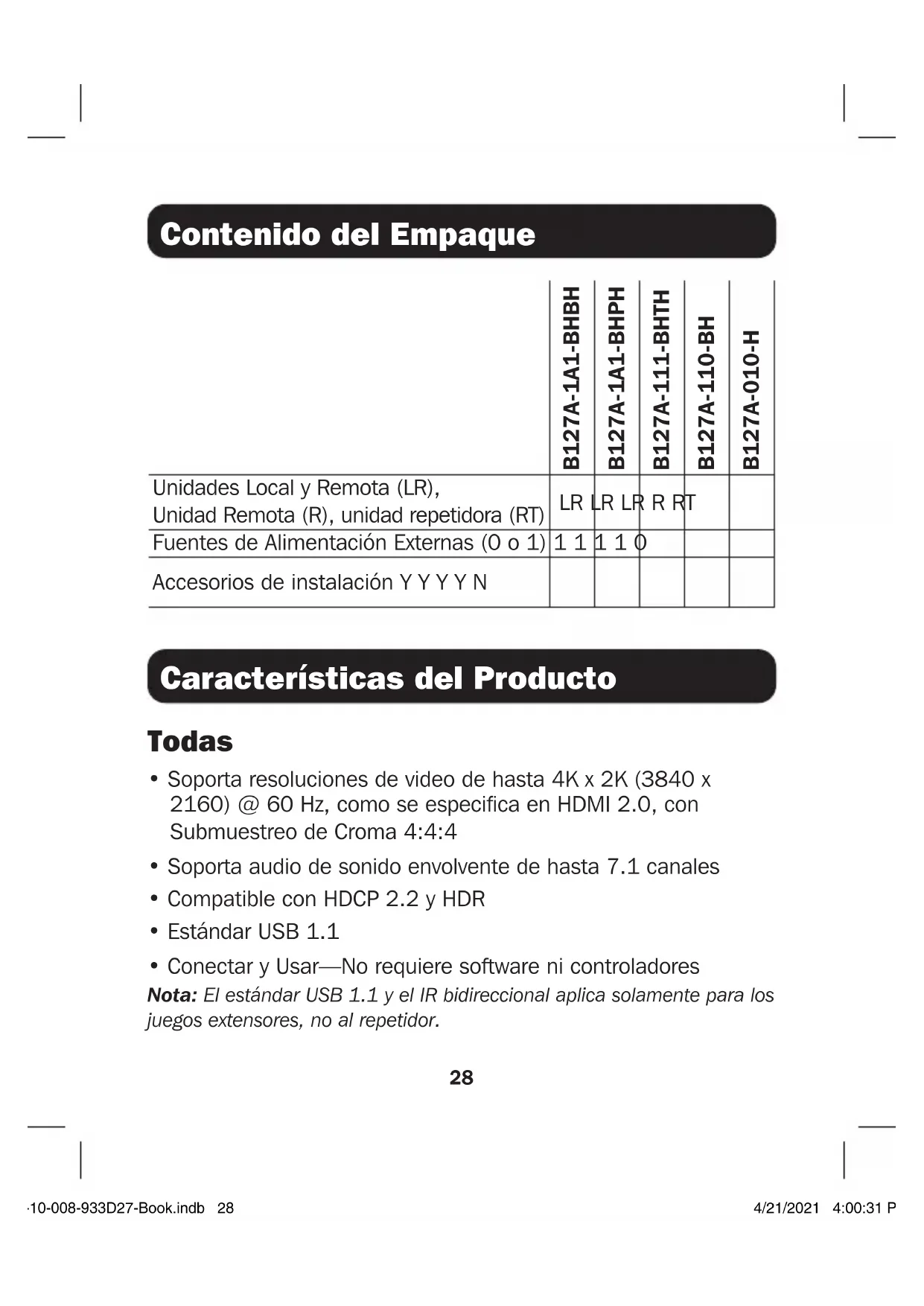 - Conectar y Usar—No requiere software ni controladores Nota: El estándar USB 1.1 y el IR bidireccional aplica solamente para los juegos extensores, no al repetidor. 20-10-008-933D27-Book.indb 2820-10-008-933D27-Book.indb 28 4/21/2021 4:00:31 PM4/21/2021 4:00:31 PM29 Características del Producto