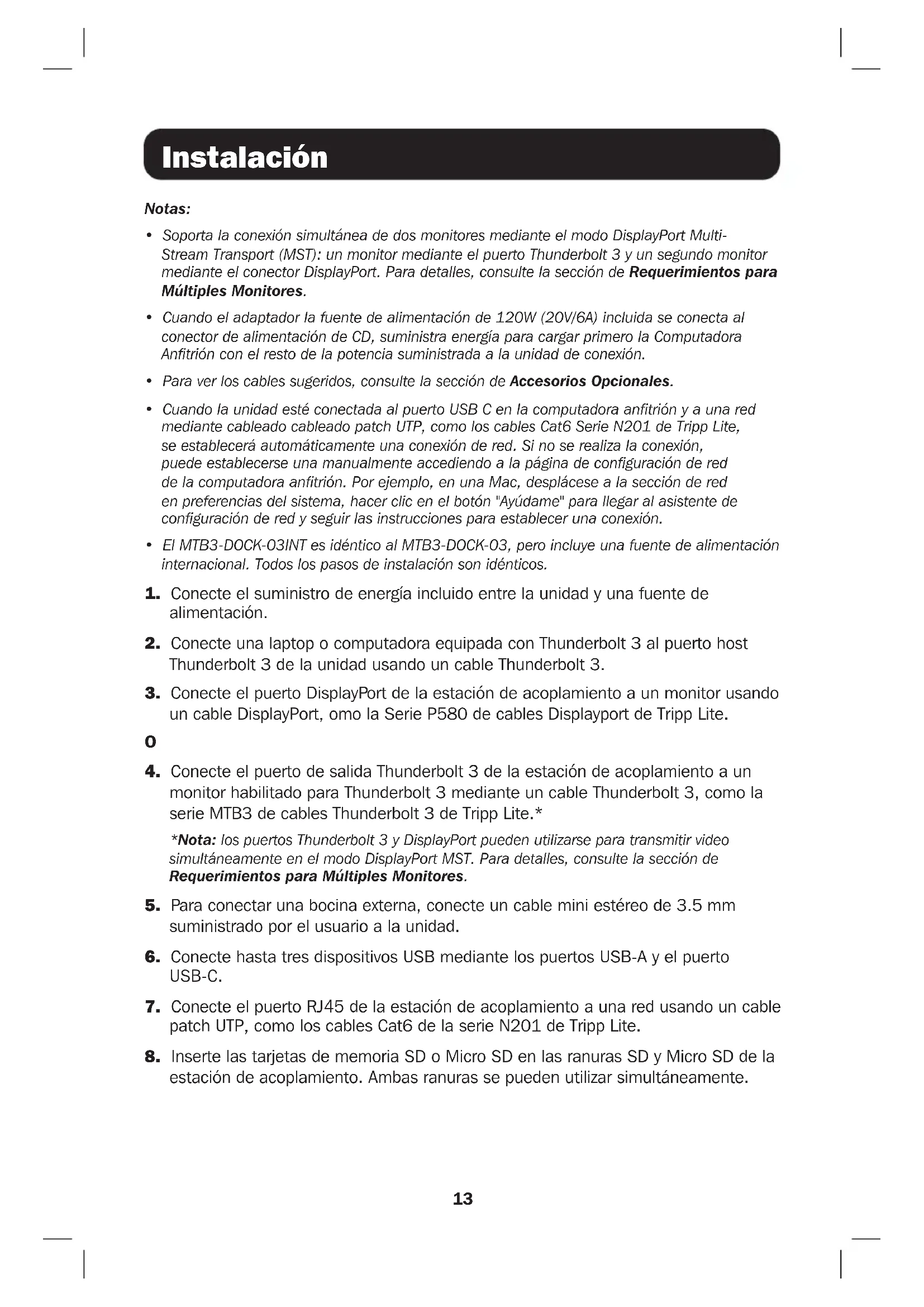 estación de acoplamiento. Ambas ranuras se pueden utilizar simultáneamente.14 Requerimientos para Múltiples Monitores El MTB3-DOCK-03 y el MTB3-DOCK-03INT soportan la conexión de dos monitores al mismo tiempo mediante el modo DisplayPort Multi-Stream Transport (MST). Conecte simultáneamente un monitor DisplayPort y un monitor equipado con Thunderbolt 3. Las limitaciones siguientes deben tenerse en cuenta al conectar a varios monitores al mismo tiempo. ¿Es Compatible la Computadora Fuente con el Modo DisplayPort MST? Cuando se conecte a una fuente de Thunderbolt 3 que soporte el modo DisplayPort MST, la información de EDID de ambos monitores conectados será leída por la computadora y aparecerán como pantallas independientes que pueden ser mostradas en modo espejo o extendido. Tanto los puertos Thunderbolt 3 y DisplayPort pueden alcanzar resoluciones de video de hasta 8K (7680 x 4320) a 30 Hz, cuando se usan con una computadora fuente equipada con Thunderbolt 3 y cable Thunderbolt 3. Los puertos pueden usarse simultáneamente a resoluciones de 8K a 30 Hz y 4K a 30 Hz. Cuando se conecta a una fuente de Thunderbolt 3 que no soporte modo DisplayPort MST, solo un puerto de video mostrará video en una base de primera entrada y siempre será el primer puerto de video conectado. ¿La Computadora Fuente Soporta una Conexión Thunderbolt 3? El MTB3-DOCK-03 y el MTB3-DOCK-03INT pueden utilizarse para transmitir video desde computadoras fuente que tengan un puerto Thunderbolt 3 o un puerto USB Type-C que soporte DisplayPort Multifunción MFDP). Para lograr un rendimiento y resolución de video óptimos, el dispositivo debe usarse con un puerto equipado con Thunderbolt 3. Cuando está conectado al puerto Thunderbolt 3 de una computadora, el conector DisplayPort soporta resoluciones de video DP1.4 de 4 Vías hasta 8K (7680 x 4320) a 30 Hz. Cuando está conectado a un puerto USB Type-C equipado con MFDP, el conector DisplayPort solo puede alcanzar resoluciones de video DP1.4 de 2 Vías hasta 4K (3840 x 2160) a 60 Hz y requiere que la computadora anfitrión soporte DP1.4 de Modo Alterno. El puerto de salida Thunderbolt 3 no se puede utilizar para transmitir video cuando está conectado a un puerto USB Type-C, pues sólo soporta transmisión de datos USB 2.0 de esta manera.15 Especificaciones Cuando está Conectado al Puerto Habilitado como Thunderbolt 3 Cuando está Conectado al Puerto USB Type-C MFDP Conectores - Entrada Puerto de CD Alimentación de CD (Hembra) Thunderbolt 3 Thunderbolt 3 Type-C (Hembra) Conectores - Salida USB-A USB 3.2 Gen 2 Type-A (Hembra) x2 USB-C USB 3.2 Gen 2 Type-C (Hembra) Ethernet RJ45 (Hembra) DisplayPort DisplayPort (Hembra) Puerto de Audio 3.5 mm (Hembra) Memoria SD 4.0 (Hembra); Micro-SD 4.0 (Hembra) Especificaciones de Transferencia de Datos Thunderbolt 3 (Entrada) Thunderbolt 3 (40 Gbps) USB 3.2 Gen 2 (26.2 Gbps) Thunderbolt 3 (Salida) Thunderbolt 3 (40 Gbps), Datos + Video USB 2.0 (480 Mbps), Datos + Carga USB-A (x2) USB 3.2 Gen 2 (10 Gbps), Datos + Carga USB-C USB 3.2 Gen 2 (10 Gbps), Datos + Carga Memoria (SD + Micro-SD) SD 4.0, mSD 4.0 (312 MB/s) Puerto de Audio Hasta 384 Khz, Tasa de Muestreo de Bits 16/24/32 Ambiental Temperatura de Operación 0 ºC a 45 °C [32 ºF a 113 °F] Humedad de Operación De 10 % a 90 % de HR, Sin Condensación Temperatura de Almacenamiento 0 °C a 70 °C [32 °F a 158 °F] Humedad de Almacenamiento De 10 % a 90 % de HR, Sin Condensación Especificaciones de Red RJ45 10/100/1000 Mbps (1 Gigabit) Especificaciones de Pantalla DisplayPort 7680 x 4320 a 30 Hz (8K UHD) 3840 x 2160 a 60 Hz (4K UHD) Thunderbolt 3 7680 x 4320 a 30 Hz Video No Soportado Pantalla Doble (Modo MST) 8K a 30 Hz + 4K a 30Hz o 4K a 60 Hz + 4K a 60 HZ Video No Soportado Especificaciones Eléctricas Fuente de Alimentación CD 120W (20V 6A) Thunderbolt 3 (Entrada) Carga PC anfitrión hasta 60W (5 V-20V 3A) Thunderbolt 3 (Salida) Conexión en cadena de hasta 6 dispositivos con capacidad de 15W (5V 3A) USB-A (BC1.2) Máximo de carga posterior de 5V 1.5A USB-A Máximo de carga posterior de 5V 900mA USB-C Máximo de carga posterior de 5V 1.5A16 Garantía Garantía Limitada de 3 años Tripp Lite garantiza durante un período de tres (3) años a partir de la fecha de compra inicial que este producto no tiene defectos de materiales ni de mano de obra. La obligación de Tripp Lite bajo esta garantía está limitada a la reparación o reemplazo (a su entera discreción) de cualquier producto defectuoso. Para obtener servicio bajo esta garantía, debe obtener un número de Autorización de Devolución de Mercancía [RMA] de Tripp Lite o de un centro de servicio autorizado de Tripp Lite. Los productos deben devolverse a Tripp Lite o a un centro de servicio autorizado de Tripp Lite con los cargos de transporte prepagados y deben acompañarse con una breve descripción del problema y un comprobante de la fecha y el lugar de compra. Esta garantía no se aplica a equipos que hayan sido dañados por accidente, negligencia o mal uso o hayan sido alterados o modificados de alguna manera. EXCEPTO COMO SE INDICA EN EL PRESENTE, TRIPP LITE NO OTORGA GARANTÍAS EXPRESAS O IMPLÍCITAS, INCLUIDAS LAS GARANTÍAS DE COMERCIABILIDAD Y ADECUACIÓN PARA UN DETERMINADO PROPÓSITO. Algunos estados no permiten la limitación o exclusión de garantías implícitas; por lo tanto, las limitaciones o exclusiones antes mencionadas pueden no aplicarse al comprador. EXCEPTO COMO SE INDICA ANTERIORMENTE, EN NINGÚN CASO TRIPP LITE SERÁ RESPONSABLE POR DAÑOS DIRECTOS, INDIRECTOS, ESPECIALES, INCIDENTALES O CONSECUENTES QUE SURJAN DEL USO DE ESTE PRODUCTO, INCLUSO SI SE ADVIERTE SOBRE LA POSIBILIDAD DE TAL DAÑO. Específicamente, Tripp Lite no es responsable por ningún costo, como pérdida de ganancia o ingresos, pérdida de equipos, pérdida del uso de equipos, pérdida de software, pérdida de datos, costos de sustituciones, reclamaciones de terceros o de cualquier otra forma. Información de Cumpl