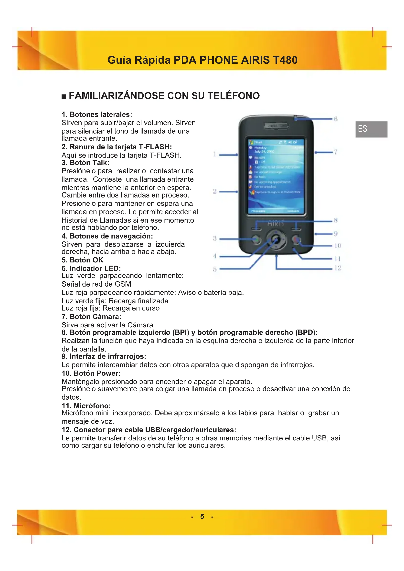 1. Botones laterales:Sirven para subir/bajar el volumen. Sirven para silenciar el tono de llamada de una llamada entrante.2. Ranura de la tarjeta T-FLASH:Aquí se introduce la tarjeta T-FLASH.3. Botón Talk:Presiónelo para realizar o contestar una llamada. Conteste una llamada entrante mientras mantiene la anterior en espera. Cambie entre dos llamadas en proceso.Presiónelo para mantener en espera una llamada en proceso. Le permite acceder al Historial de Llamadas si en ese momento no está hablando por teléfono.4. Botones de navegación:Sirven para desplazarse a izquierda, derecha, hacia arriba o hacia abajo. 5. Botón OK 6. Indicador LED:Luz verde parpadeando lentamente: Señal de red de GSM Luz roja parpadeando rápidamente: Aviso o batería baja.Luz verde fija: Recarga finalizadaLuz roja fija: Recarga en curso7. Botón Cámara:Sirve para activar la Cámara.8. Botón programable izquierdo (BPI) y botón programable derecho (BPD): Realizan la función que haya indicada en la esquina derecha o izquierda de la parte inferior de la pantalla.9. Interfaz de infrarrojos:Le permite intercambiar datos con otros aparatos que dispongan de infrarrojos.10. Botón Power:Manténgalo presionado para encender o apagar el aparato.Presiónelo suavemente para colgar una llamada en proceso o desactivar una conexión de datos.11. Micrófono:Micrófono mini incorporado. Debe aproximárselo a los labios para hablar o grabar un mensaje de voz. 12. Conector para cable USB/cargador/auriculares:Le permite transferir datos de su teléfono a otras memorias mediante el cable USB, así como cargar su teléfono o enchufar los auriculares.