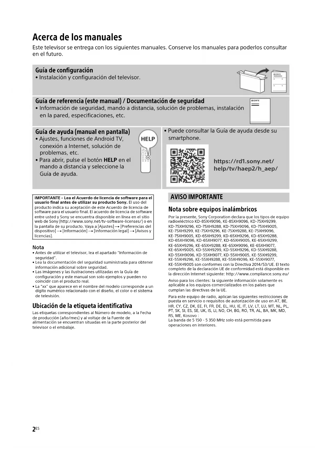 - Antes de utilizar el televisor, lea el apartado “Información de seguridad”.• Lea la documentación del seguridad suministrada para obtener información adicional sobre seguridad.• Las imágenes y las ilustraciones utilizadas en la Guía de configuración y este manual son solo ejemplos y pueden no coincidir con el producto real.• La “xx” que aparece en el nombre del modelo corresponde a un dígito numérico relacionado con el diseño, el color o el sistema de televisión. Ubicación de la etiqueta identificativa Las etiquetas correspondientes al Número de modelo, a la Fecha de producción (año/mes) y al voltaje de la Fuente de alimentación se encuentran situadas en la parte posterior del televisor o el embalaje. AVISO IMPORTANTE Nota sobre equipos inalámbricos Por la presente, Sony Corporation declara que los tipos de equipo radioeléctrico KD-85XH9096, KE-85XH9096, KD-75XH9299, KD-75XH9296, KD-75XH9288, KD-75XH9096, KD-75XH9005, KE-75XH9299, KE-75XH9296, KE-75XH9288, KE-75XH9096, KE-75XH9005, KD-65XH9299, KD-65XH9296, KD-65XH9288, KD-65XH9096, KD-65XH9077, KD-65XH9005, KE-65XH9299, KE-65XH9296, KE-65XH9288, KE-65XH9096, KE-65XH9077, KE-65XH9005, KD-55XH9299, KD-55XH9296, KD-55XH9288, KD-55XH9096, KD-55XH9077, KD-55XH9005, KE-55XH9299, KE-55XH9296, KE-55XH9288, KE-55XH9096, KE-55XH9077, KE-55XH9005 son conformes con la Directiva 2014/53/UE. El texto completo de la declaración UE de conformidad está disponible en la dirección Internet siguiente: http://www.compliance.sony.eu/Aviso para los clientes: la siguiente información solamente es aplicable a los equipos comercializados en los países que cumplan las directivas de la UE.Para este equipo de radio, aplican las siguientes restricciones de puesta en servicio o requisitos de autorización de uso en AT, BE, HR, CY, CZ, DK, EE, FI, FR, DE, EL, HU, IE, IT, LV, LT, LU, MT, NL, PL, PT, SK, SI, ES, SE, UK, IS, LI, NO, CH, BG, RO, TR, AL, BA, MK, MD, RS, ME, Kosovo :La banda de 5 150 - 5 350 MHz solo está permitida para operaciones en interiores. Acerca de los manuales Este televisor se entrega con los siguientes manuales. Conserve los manuales para poderlos consultar en el futuro. Guía de configuración