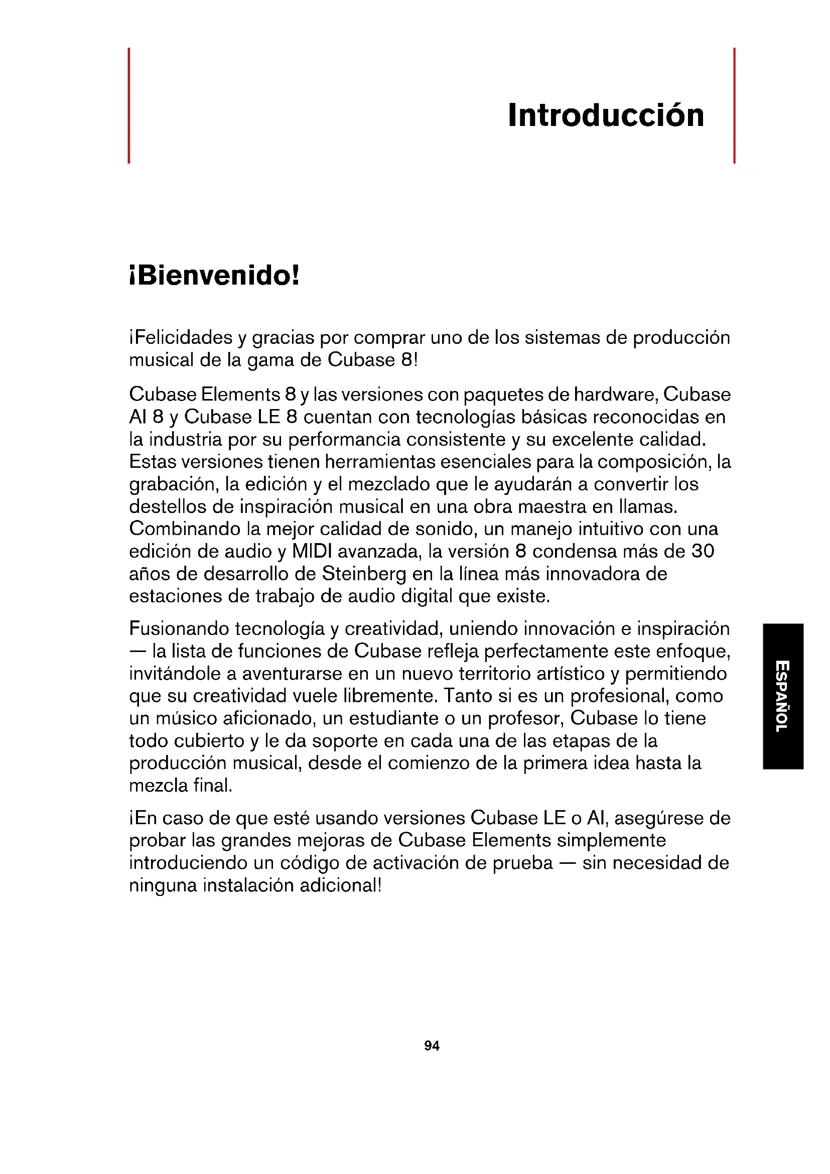 RISULTATO Siete ora pronti per registrare e riprodurre l’audio in Cubase. IMPORTANTE Lo Start Center di Cubase contiene un link a un progetto demo scaricabile dal sito web di Steinberg. Se si riesce a riprodurlo con successo sulla propria postazione audio, significa che il programma è stato configurato correttamente. NOTA Per muovere i vostri primi passi con Cubase, vi raccomandiamo di prendere visione dei video tutorial introduttivi alle nuove funzioni di Cubase, disponibili sul canale Steinberg di YouTube.EspañolCristina Bachmann, Heiko Bischoff, Christina Kaboth, Insa Mingers, Matthias Obrecht, Sabine Pfeifer, Kevin Quarshie, Benjamin Schütte Traducción por Josep Llodrá El documento PDF ofrece un acceso mejorado para usuarios con problemas de visión. Por favor, tenga en cuenta que debido a la complejidad y al número de imágenes en este documento, no es posible incluir textos descriptivos a las imágenes. La información en este documento está sujeta a cambios sin notificación previa y no representa un compromiso por parte de Steinberg Media Technologies GmbH. El software descrito en este documento está sujeto al Acuerdo de Licencia y no se puede copiar a otros medios excepto que esté permitido específicamente en el Acuerdo de Licencia. Ninguna parte de esta publicación se puede copiar, reproducir, retransmitir o grabar, bajo ningún propósito, sin previo permiso escrito de Steinberg Media Technologies GmbH. Los titulares de una licencia registrada del producto descrito aquí pueden imprimir una copia de este documento para su uso personal. Todos los nombres de productos y compañías son marcas registradas ™ o ® por sus respectivos propietarios. Para más información, visite por favor www.steinberg.net/trademarks. © Steinberg Media Technologies GmbH, 2015. Todos los derechos reservados.92 ESPAÑOL Tabla de Contenidos 94 Introducción 94 ¡Bienvenido! 95 Acerca de la Documentación y la Ayuda 97 Convenciones tipográficas 98 Cómo puede contactar con nosotros 100 Requisitos del sistema e instalación 100 Requisitos de sistema 101 Instalar el programa 102 Activar su licencia 105 Instalación del hardware 108 Configurar el sistema9394 ESPAÑOL Introducción ¡Bienvenido! ¡Felicidades y gracias por comprar uno de los sistemas de producción musical de la gama de Cubase 8! Cubase Elements 8 y las versiones con paquetes de hardware, Cubase AI 8 y Cubase LE 8 cuentan con tecnologías básicas reconocidas en la industria por su performancia consistente y su excelente calidad. Estas versiones tienen herramientas esenciales para la composición, la grabación, la edición y el mezclado que le ayudarán a convertir los destellos de inspiración musical en una obra maestra en llamas. Combinando la mejor calidad de sonido, un manejo intuitivo con una edición de audio y MIDI avanzada, la versión 8 condensa más de 30 años de desarrollo de Steinberg en la línea más innovadora de estaciones de trabajo de audio digital que existe. Fusionando tecnología y creatividad, uniendo innovación e inspiración — la lista de funciones de Cubase refleja perfectamente este enfoque, invitándole a aventurarse en un nuevo territorio artístico y permitiendo que su creatividad vuele libremente. Tanto si es un profesional, como un músico aficionado, un estudiante o un profesor, Cubase lo tiene todo cubierto y le da soporte en cada una de las etapas de la producción musical, desde el comienzo de la primera idea hasta la mezcla final. ¡En caso de que esté usando versiones Cubase LE o AI, asegúrese de probar las grandes mejoras de Cubase Elements simplemente introduciendo un código de activación de prueba — sin necesidad de ninguna instalación adicional!Introducción Acerca de la Documentación y la Ayuda