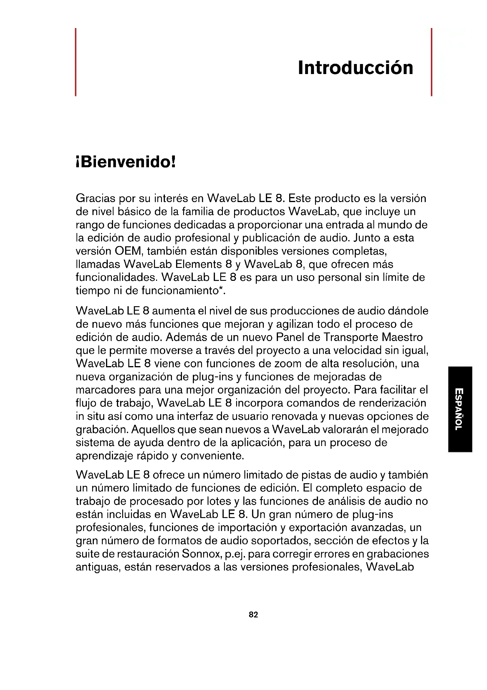 Configurare il proprio sistema 77EspañolCristina Bachmann, Heiko Bischoff, Christina Kaboth, Insa Mingers, Sabine Pfeifer, Benjamin Schütte Traducción por Josep Llodrá El documento PDF ofrece un acceso mejorado para usuarios con problemas de visión. Por favor, tenga en cuenta que debido a la complejidad y al número de imágenes en este documento, no es posible incluir textos descriptivos a las imágenes. La información en este documento está sujeta a cambios sin notificación previa y no represent a un compromiso por parte de Steinberg Media Technologies GmbH. El software descrito en este documento está sujeto al Acuerdo de Licencia y no se puede copiar a otros medios excepto que esté permitido específicamente en el Acuerdo de Licencia. Ninguna parte de esta publicación se puede copiar, reproducir, retransmitir o grabar, bajo ningún propósito, sin previo permiso escrito de Steinberg Media Technologies GmbH. Los titulares de una licencia registrada del producto descrito aquí pueden imprimir una copia de este documento para su uso personal. Todos los nombres de productos y compañías son marcas registradas ™ o ® por sus resp ectivos propietarios. Para más información, visite por favor www.steinberg.net/trademarks. Fecha de lanzamiento: 18 junio 2013 © Steinberg Media Technologies GmbH, 2013. Todos los derechos reservados.80 ESPAÑOL Tabla de contenidos 82 Introducción 82 ¡Bienvenido! 84 Acerca de la Documentación y la Ayuda 85 Convenciones tipográficas 85 Cómo puede contactar con nosotros 88 Requisitos del sistema e instalación 88 Requisitos de sistema 89 Instalar el programa 90 Registrar y activar su licencia 91 Instalación del hardware 94 Configurar el sistema8182 ESPAÑOL Introducción ¡Bienvenido! Gracias por su interés en WaveLab LE 8. Este producto es la versión de nivel básico de la familia de productos WaveLab, que incluye un rango de funciones dedicadas a proporcionar una entrada al mundo de la edición de audio profesional y publicación de audio. Junto a esta versión OEM, también están disponibles versiones completas, llamadas WaveLab Elements 8 y WaveLab 8, que ofrecen más funcionalidades. WaveLab LE 8 es para un uso personal sin límite de tiempo ni de funcionamiento*. WaveLab LE 8 aumenta el nivel de sus producciones de audio dándole de nu evo más funciones que mejoran y agilizan todo el proceso de edición de audio. Además de un nuevo Panel de Transporte Maestro que le permite moverse a través del proyecto a una velocidad sin igual, WaveLab LE 8 viene con funciones de zoom de alta resolución, una nueva organización de plug-ins y funciones de mejoradas de marcadores para una mejor organización del proyecto. Para facilitar el flujo de trabajo, WaveLab LE 8 incorpora comandos de renderización in situ así como una interfaz de usuario renovada y nuevas opciones de grabación. Aquellos que sean nuevos a WaveLab valorarán el mejorado sistema de ayuda dentro de la aplicación, para un proceso de aprendizaje rápido y conveniente. WaveLab LE 8 ofrece un número limitado de pistas de audio y también un número limitado de funciones de edición. El completo espacio de trabajo de procesado por lotes y las funciones de análisis de audio no están incluidas en WaveLab LE 8. Un gran número de plug-ins profesionales, funciones de importación y exportación avanzadas, un gran número de formatos de audio soportados, sección de efectos y la suite de restauración Sonnox, p.ej. para corregir errores en grabaciones antiguas, están reservados a las versiones profesionales, WaveLabIntroducción ¡Bienvenido!