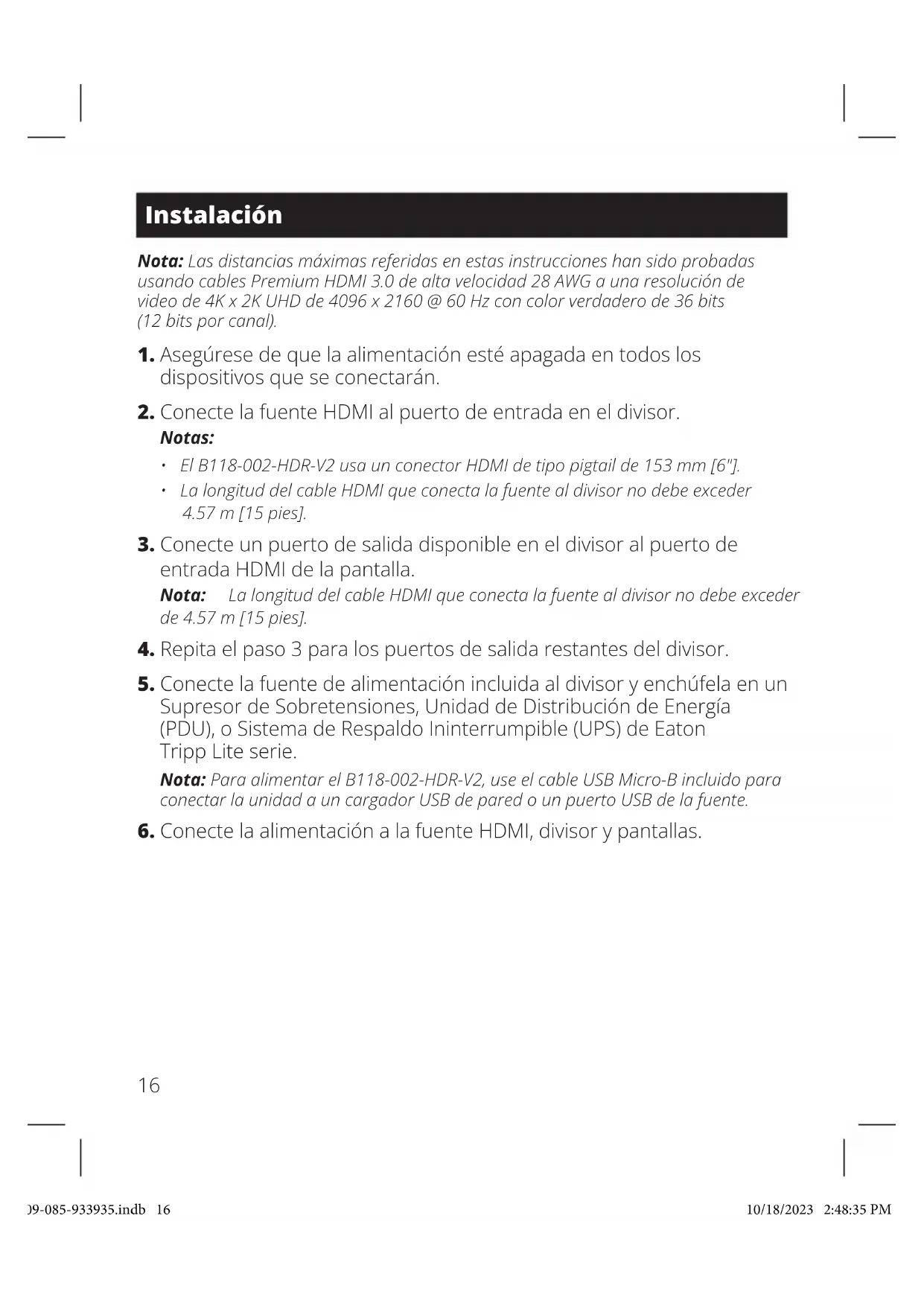 3.Conecteunpuertodesalidadisponibleeneldivisoralpuertode entrada HDMI de la pantalla. Nota: La longitud del cable HDMI que conecta la fuente al divisor no debe exceder de 4.57 m [15 pies]. 4.Repitaelpaso3paralospuertosdesalidarestantesdeldivisor. 5.Conectelafuentedealimentaciónincluidaaldivisoryenchúfelaenun SupresordeSobretensiones,UnidaddeDistribucióndeEnergía (PDU),oSistemadeRespaldoIninterrumpible(UPS)deEaton TrippLiteserie. Nota: Para alimentar el B118-002-HDR-V2, use el cable USB Micro-B incluido para conectar la unidad a un cargador USB de pared o un puerto USB de la fuente. 6.ConectelaalimentaciónalafuenteHDMI,divisorypantallas. 23-09-085-933935.indb 1623-09-085-933935.indb 16 10/18/2023 2:48:35 PM10/18/2023 2:48:35 PM17 Instalación Instalación en Cascada Elnúmerodemonitoresconectadospuedeampliarsehastatresniveles encascadadedivisoresjuntos.Puedenconectarsehasta64pantallas colocandoencascadaeldivisordecadapuertoenunainstalación detresniveles.SerecomiendausarcablesHDMIPremiumdeAlta VelocidaddelaSerieP569-XXX-CERTdeTrippLite. Nota: Esta función solo está disponible para modelos B118-002-HDR y B118-004-HDR. 1.Asegúresedequetodoslosdispositivosqueconectaráesténapagados. 2.ConectelafuentedeHDMIalpuertodeentradaeneldivisordel primernivel. Nota: La longitud del cable HDMI que conecta la fuente del separador no debe exceder de 4.88 m [16 pies]. 3.ConecteunpuertodeSalidadisponibleeneldivisordeprimernivela unpuertodeentradaHDMIenundivisordelsegundonivel. Nota: La longitud del cable HDMI que conecta los divisores del primer y segundo niveles no debe exceder de 3.05 m [10 pies]. 4.Repitaelpaso3paracadadivisoradicionalquedeseeagregar(no másde3nivelesdedivisorespuedenserconectadosencascada). 5.Conecteunpuertodesalidadisponibleensu(s)divisor(es)alpuerto deentradaHDMIdesu(s)pantalla(s). Nota: La longitud del cable HDMI que conecta del divisor a la pantalla no debe exceder de 4.88 m [16 pies]. 6.Repitaelpaso5paralospuertosdeSalidarestantesenlainstalación. 7.Conectelafuentedealimentaciónincluidaacadadivisorenla instalaciónyenchúfelaenunSupresordeSobretensiones,Unidadde DistribucióndeEnergía(PDU),oSistemadeRespaldoIninterrumpible (UPS)deEatonTrippLiteserie.