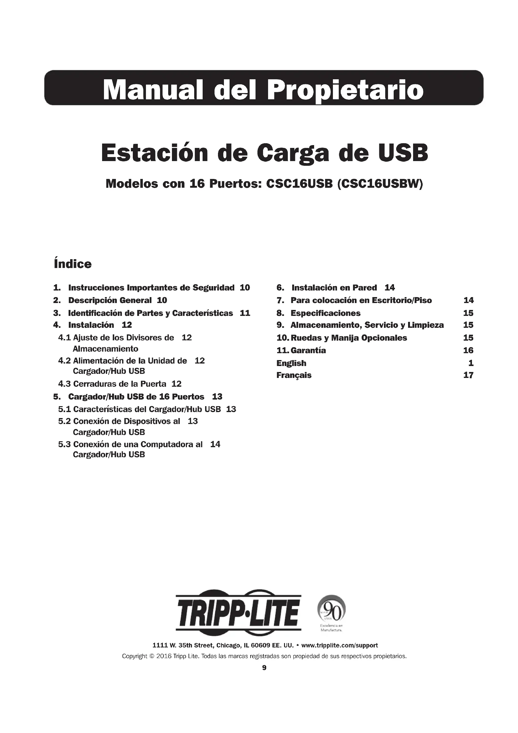 English 1 Français 17 Estación de Carga de USB Modelos con 16 Puertos: CSC16USB (CSC16USBW) 1111 W. 35th Street, Chicago, IL 60609 EE. UU. • www.tripplite.com/support Copyright © 2016 Tripp Lite. Todas las marcas registradas son propiedad de sus respectivos propietarios.