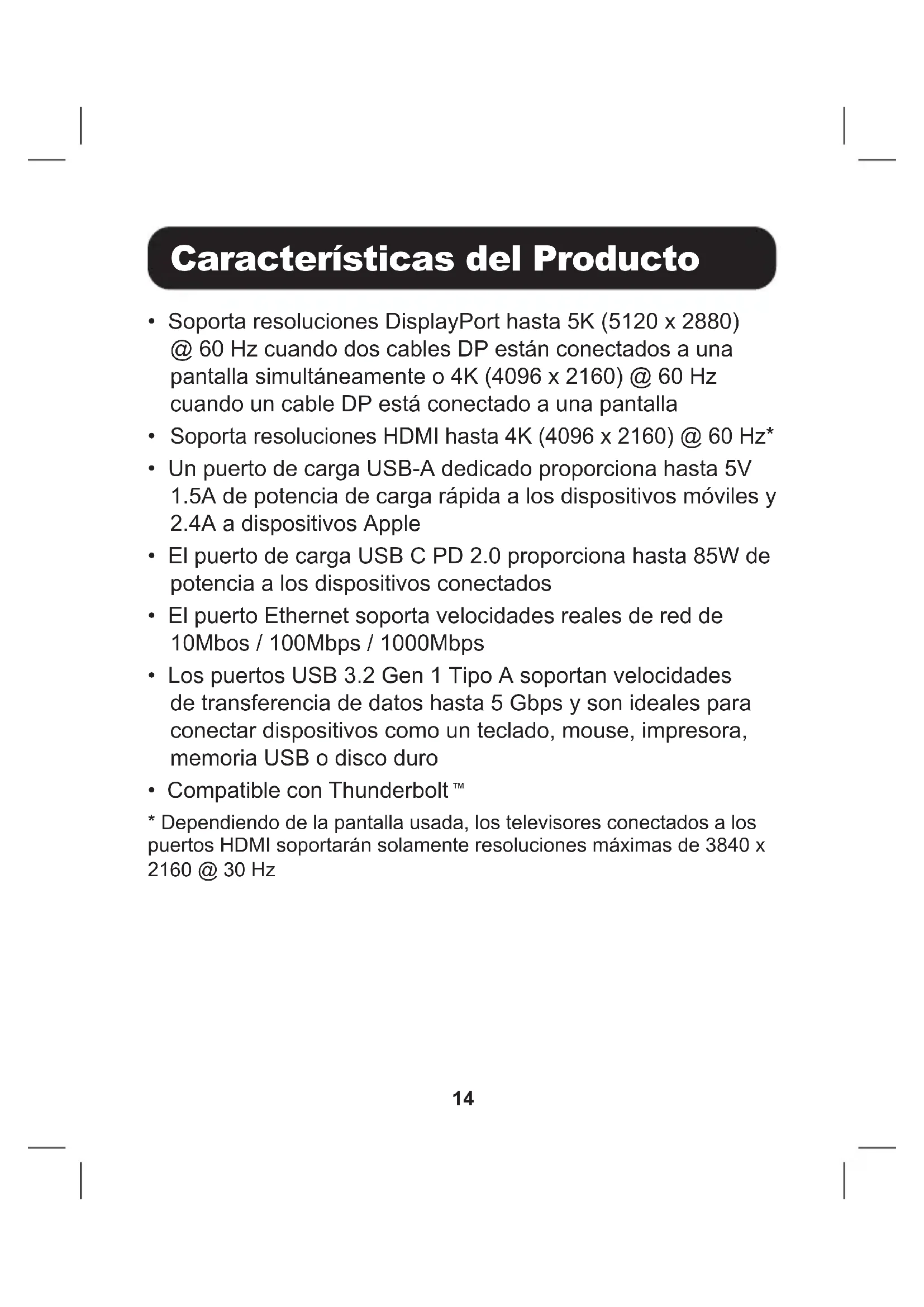 de conexión y encienda la unidad usando el botón de encendido ubicado a la izquierda del puerto de CD.21 Especicaciones Entrada USB C Salida (x2) HDMI (x2) DisplayPort RJ45 (x5) USB 3.2 Gen 1 Tipo A USB C (x2) 3.5 mm Video* DisplayPort (Solo uno): 4096 x 2160 @ 60 Hz DisplayPort (Dos): 5120 x 2880 @ 60 Hz HDMI: 4096 x 2160 @ 60 Hz Audio (3.5 mm) Sonido Envolvente de 2.1 Canales Ethernet (RJ45) 10/100/1000 Mbps Fuente de Alimentación Entrada: 100V ~ 240V, 50Hz / 60 Hz, 1.8A Salida: 20V 6.75A Especicación DisplayPort