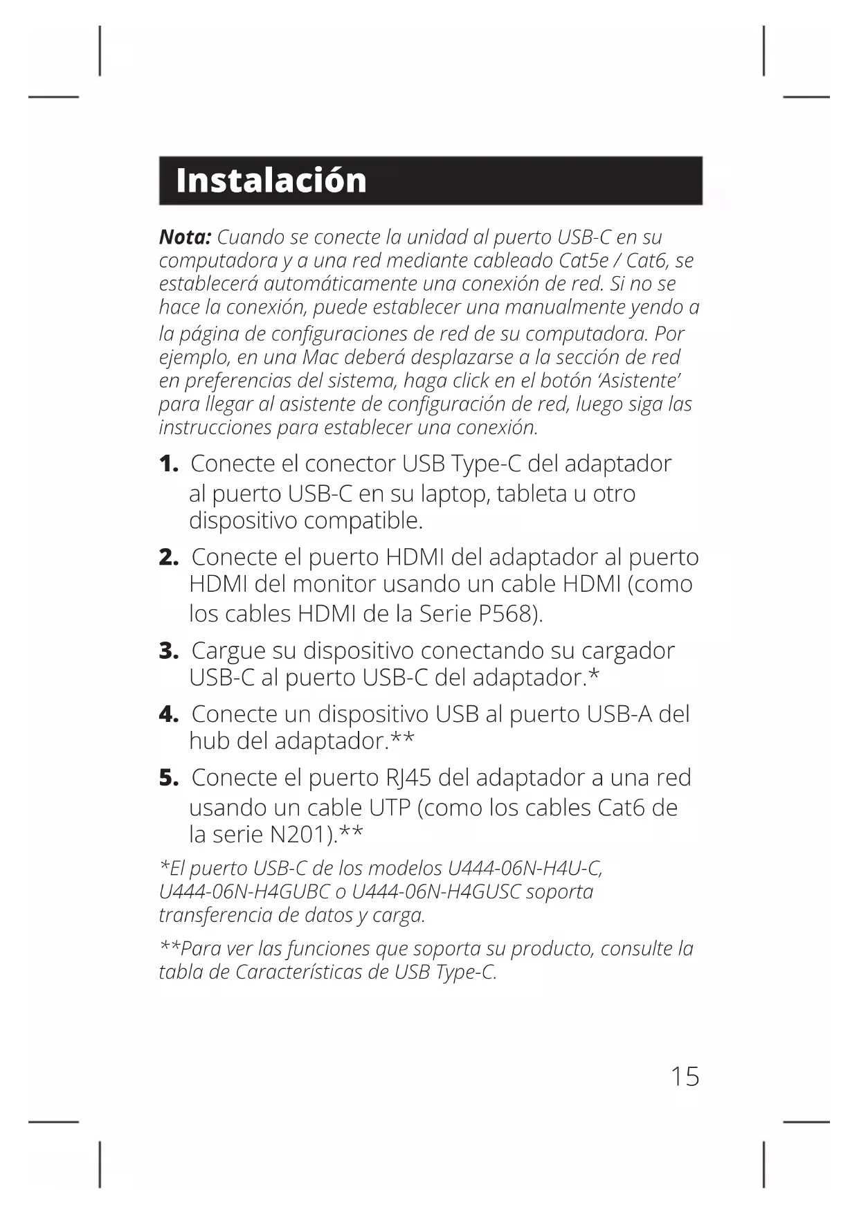 usando un cable UTP (como los cables Cat6 de la serie N201).** *El puerto USB-C de los modelos U444-06N-H4U-C, U444-06N-H4GUBC o U444-06N-H4GUSC soporta transferencia de datos y carga. **Para ver las funciones que soporta su producto, consulte la tabla de Características de USB Type-C.16 Especicaciones Modelos U444-06N-H4-C U444-06N-H4B-C U444-06N-H4U-C U444-06N-H4UB-C Conectores de Entrada USB USB-C (Macho) Soporta Carga por Puerto USB-C