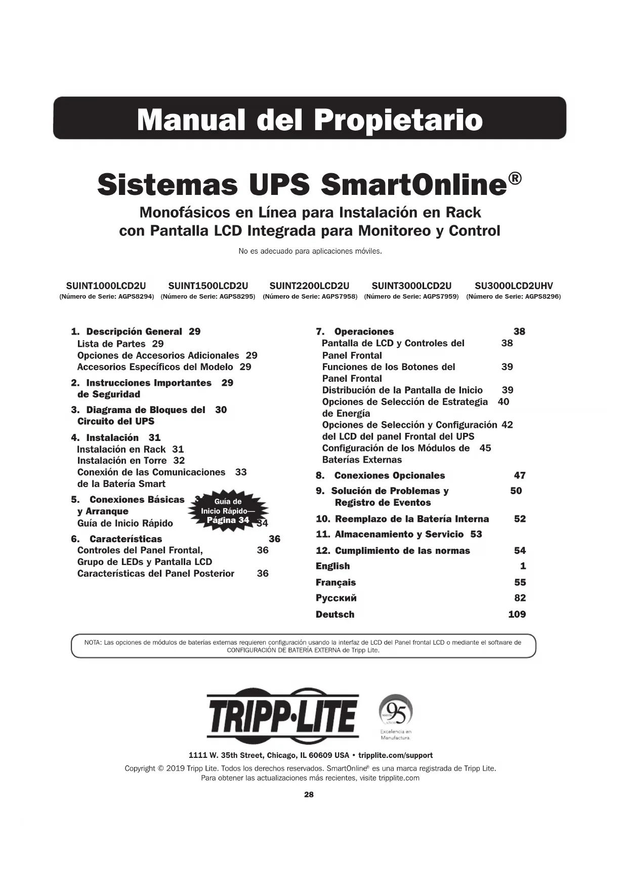 English 1 Français 55 Русский 82 Deutsch 109 NOTA: Las opciones de módulos de baterías externas requieren configuración usando la interfaz de LCD del Panel frontal LCD o mediante el software de CONFIGURACIÓN DE BATERÍA EXTERNA de Tripp Lite.1111 W. 35th Street, Chicago, IL 60609 USA • tripplite.com/supportCopyright © 2019 Tripp Lite. Todos los derechos reservados. SmartOnline es una marca registrada de Tripp Lite. Para obtener las actualizaciones más recientes, visite tripplite.comOwner’s ManualOwner’s Manual