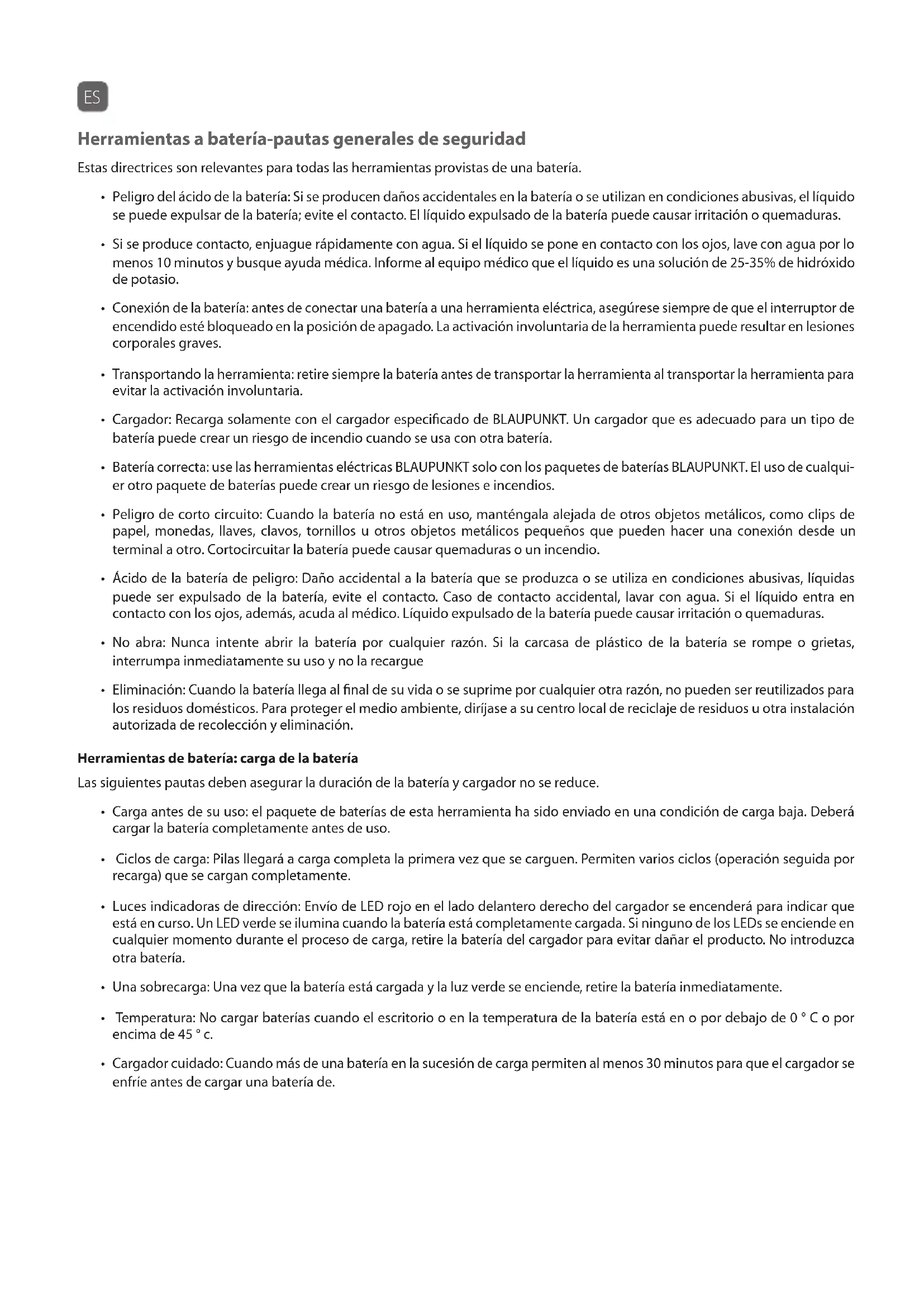 - Batería correcta: use las herramientas eléctricas BLAUPUNKT solo con los paquetes de baterías BLAUPUNKT. El uso de cualqui- er otro paquete de baterías puede crear un riesgo de lesiones e incendios.