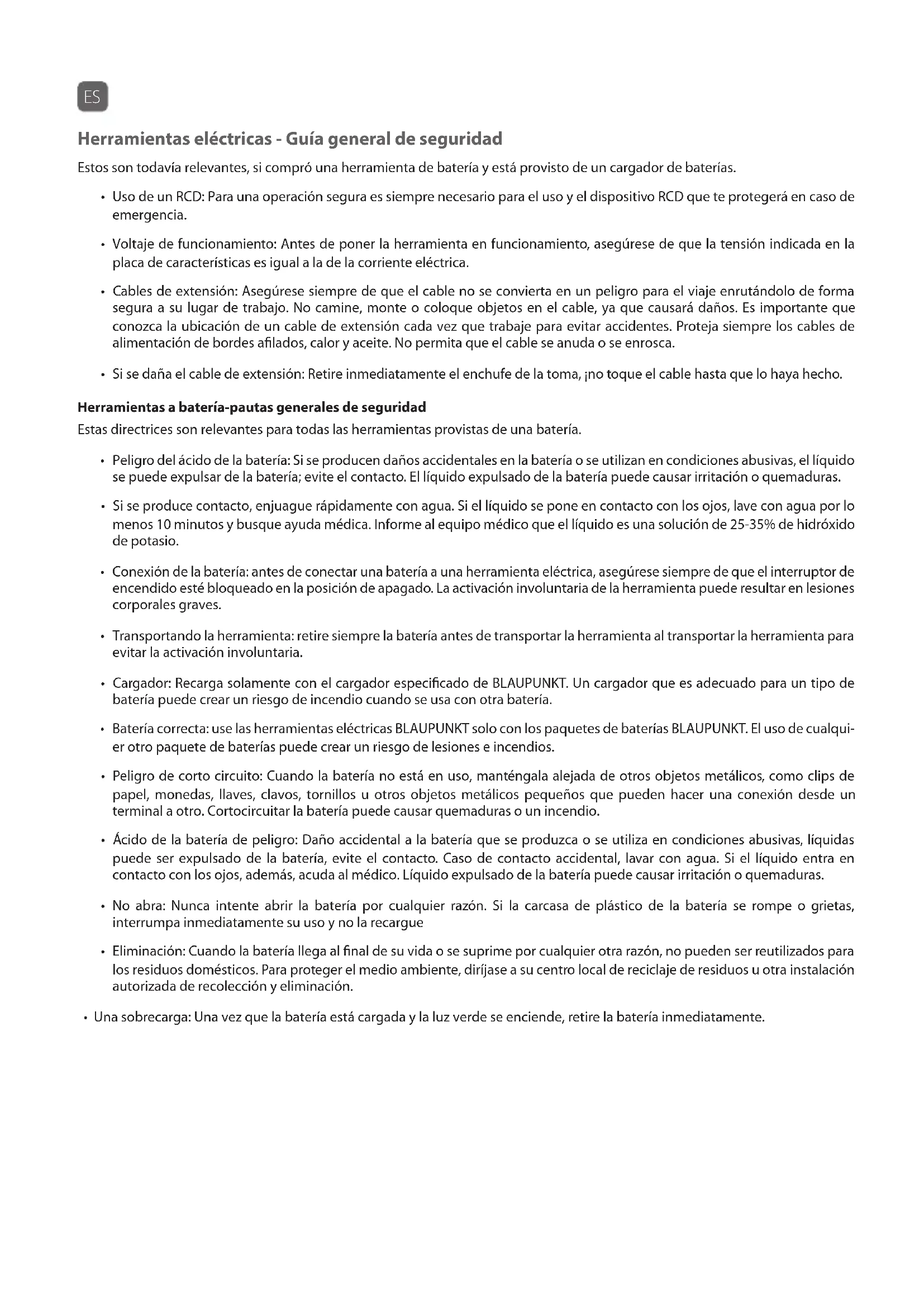 - Batería correcta: use las herramientas eléctricas BLAUPUNKT solo con los paquetes de baterías BLAUPUNKT. El uso de cualqui- er otro paquete de baterías puede crear un riesgo de lesiones e incendios.