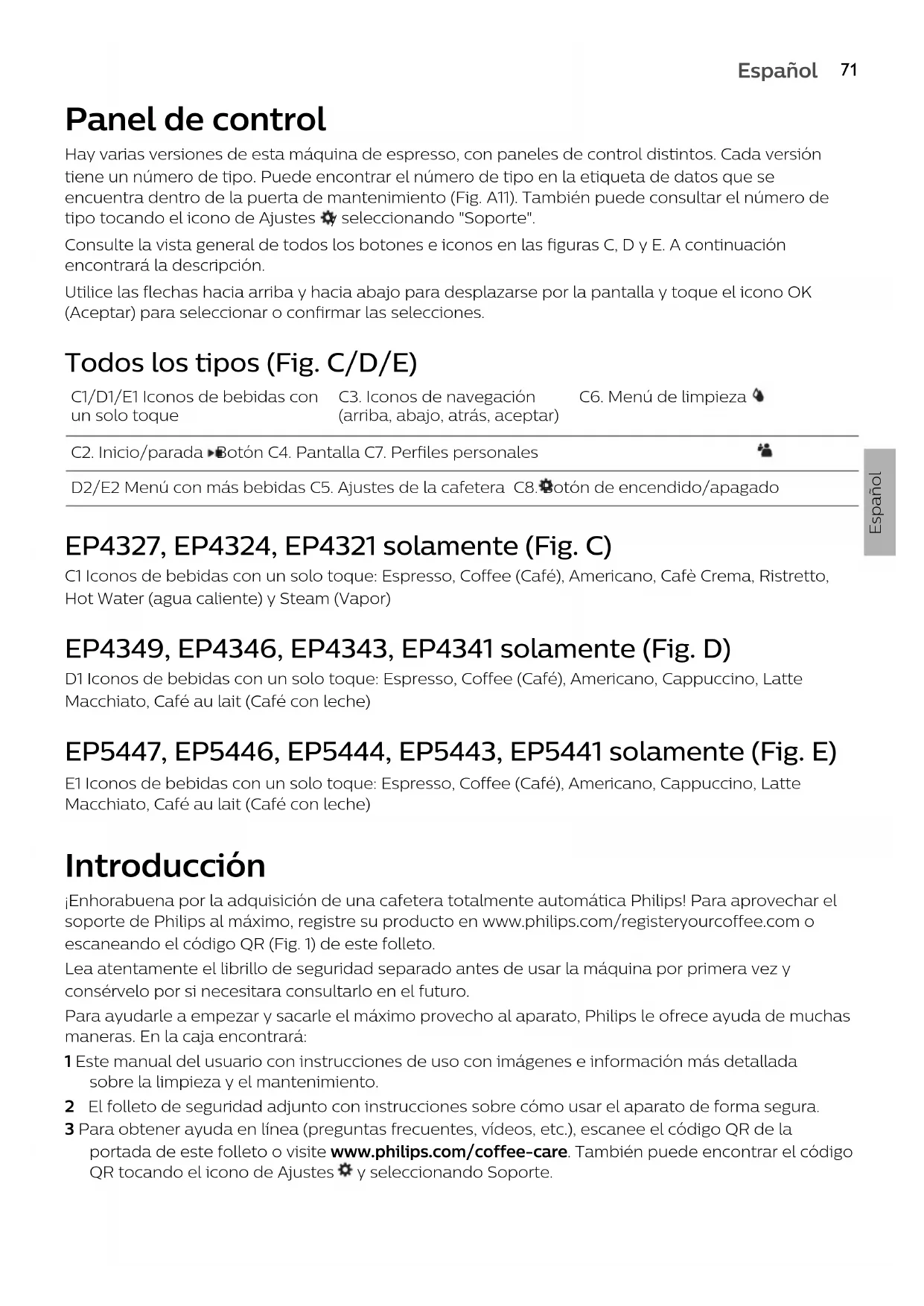 EspañolPanel de control Hay varias versiones de esta máquina de espresso, con paneles de control distintos. Cada versión tiene un número de tipo. Puede encontrar el número de tipo en la etiqueta de datos que se encuentra dentro de la puerta de mantenimiento (Fig.A11). También puede consultar el número de tipo tocando el icono de Ajustes y seleccionando "Soporte". Consulte la vista general de todos los botones e iconos en las figuras C, D y E. A continuación encontrará la descripción. Utilice las flechas hacia arriba y hacia abajo para desplazarse por la pantalla y toque el icono OK (Aceptar) para seleccionar o confirmar las selecciones. Todos los tipos (Fig. C/D/E) C1/D1/E1 Iconos de bebidas con un solo toque C3. Iconos de navegación (arriba, abajo, atrás, aceptar) C6. Menú de limpieza C2. Inicio/parada Botón C4. Pantalla C7. Perfiles personales D2/E2 Menú con más bebidas C5. Ajustes de la cafetera C8. Botón de encendido/apagado EP4327, EP4324, EP4321 solamente (Fig. C) C1 Iconos de bebidas con un solo toque: Espresso, Coffee (Café), Americano, Cafè Crema, Ristretto, Hot Water (agua caliente) y Steam (Vapor) EP4349, EP4346, EP4343, EP4341 solamente (Fig. D) D1 Iconos de bebidas con un solo toque: Espresso, Coffee (Café), Americano, Cappuccino, Latte Macchiato, Café au lait (Café con leche) EP5447, EP5446, EP5444, EP5443, EP5441 solamente (Fig. E) E1 Iconos de bebidas con un solo toque: Espresso, Coffee (Café), Americano, Cappuccino, Latte Macchiato, Café au lait (Café con leche) Introducción ¡Enhorabuena por la adquisición de una cafetera totalmente automática Philips! Para aprovechar el soporte de Philips al máximo, registre su producto en www.philips.com/registeryourcoffee.com o escaneando el código QR (Fig. 1) de este folleto. Lea atentamente el librillo de seguridad separado antes de usar la máquina por primera vez y consérvelo por si necesitara consultarlo en el futuro. Para ayudarle a empezar y sacarle el máximo provecho al aparato, Philips le ofrece ayuda de muchas maneras. En la caja encontrará: 1 Este manual del usuario con instrucciones de uso con imágenes e información más detallada sobre la limpieza y el mantenimiento. 2 El folleto de seguridad adjunto con instrucciones sobre cómo usar el aparato de forma segura. 3 Para obtener ayuda en línea (preguntas frecuentes, vídeos, etc.), escanee el código QR de la portada de este folleto o visite www.philips.com/coffee-care. También puede encontrar el código QR tocando el icono de Ajustes y seleccionando Soporte.