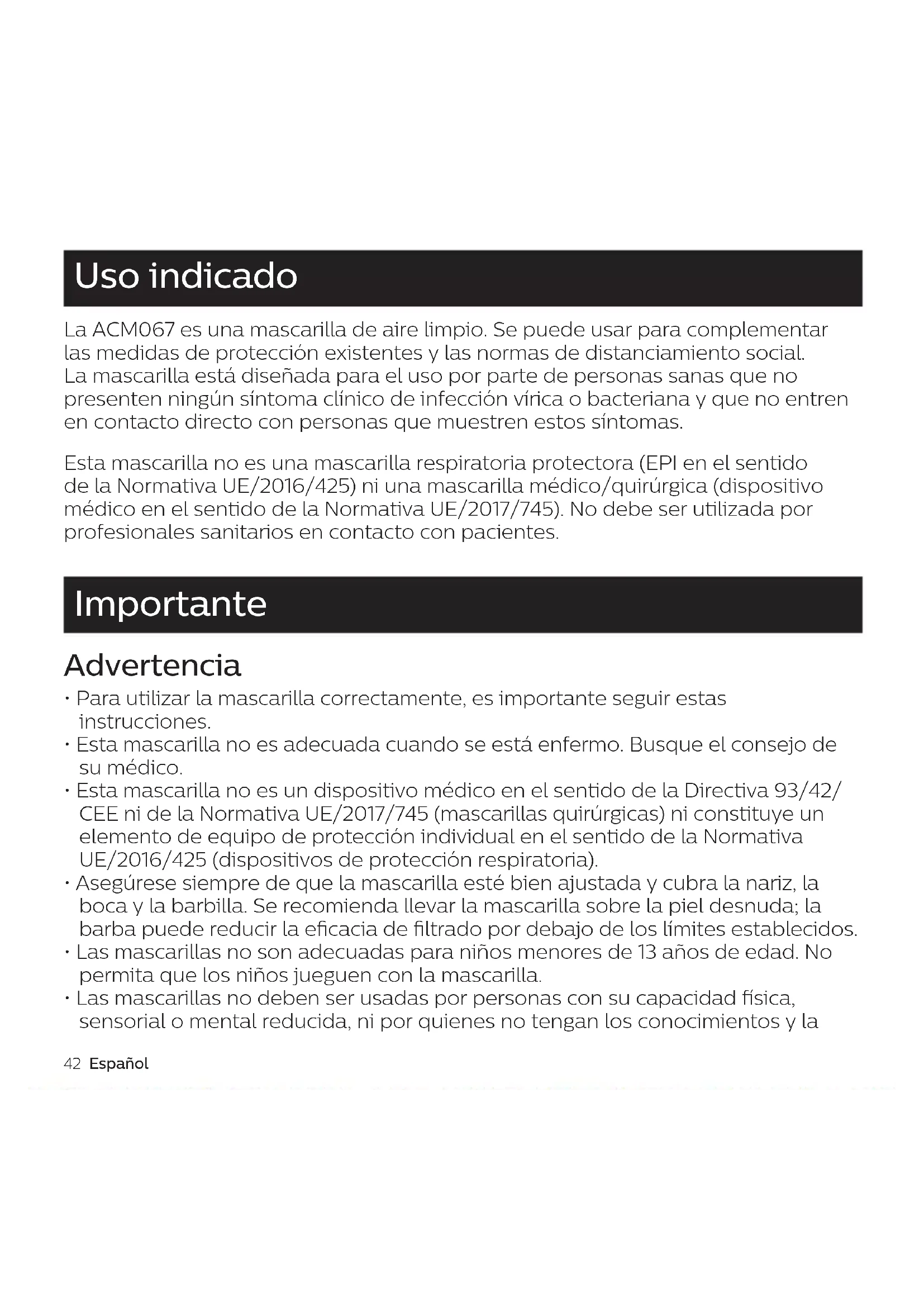 - Utilice el cable USB original para cargar el ventilador eléctrico. El adaptador/ cargador no está incluido. El ventilador eléctrico solo se debe cargar con un adaptador/cargador USB de 5 V aprobado por la autoridad o el gobierno local. AMC067-AirMasks_3000.062.5277.2_BOOKLET_120x120mm_BW.indd 42AMC067-AirMasks_3000.062.5277.2_BOOKLET_120x120mm_BW.indd 42 01-03-21 11:2501-03-21 11:25Español 43 Uso indicado La ACM067 es una mascarilla de aire limpio. Se puede usar para complementar las medidas de protección existentes y las normas de distanciamiento social. La mascarilla está diseñada para el uso por parte de personas sanas que no presenten ningún síntoma clínico de infección vírica o bacteriana y que no entren en contacto directo con personas que muestren estos síntomas. Esta mascarilla no es una mascarilla respiratoria protectora (EPI en el sentido de la Normativa UE/2016/425) ni una mascarilla médico/quirúrgica (dispositivo médico en el sentido de la Normativa UE/2017/745). No debe ser utilizada por profesionales sanitarios en contacto con pacientes. Importante Advertencia