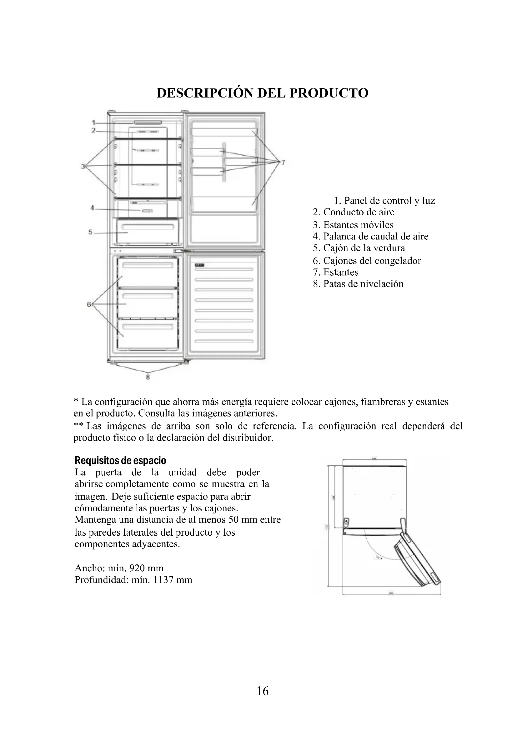 - La configuración que ahorra más energía requiere colocar cajones, fiambreras y estantes en el producto. Consulta las imágenes anteriores. ** Las imágenes de arriba son solo de referencia. La configuración real dependerá del producto físico o la declaración del distribuidor. Requisitos de espacio La puerta de la unidad debe poder abrirse completamente como se muestra en la imagen. Deje suficiente espacio para abrir cómodamente las puertas y los cajones. Mantenga una distancia de al menos 50 mm entre las paredes laterales del producto y los componentes adyacentes. Ancho: mín. 920 mm Profundidad: mín. 1137 mm17 Tecla de ENCENDIDO/APAGADO, utilizada para encender y apagar el aparato. Tecla de AJUSTES, utilizada para ajustar la temperatura o para seleccionar la función Súper Fresco. Icono Súper Fresco, muestra si la función está activada.