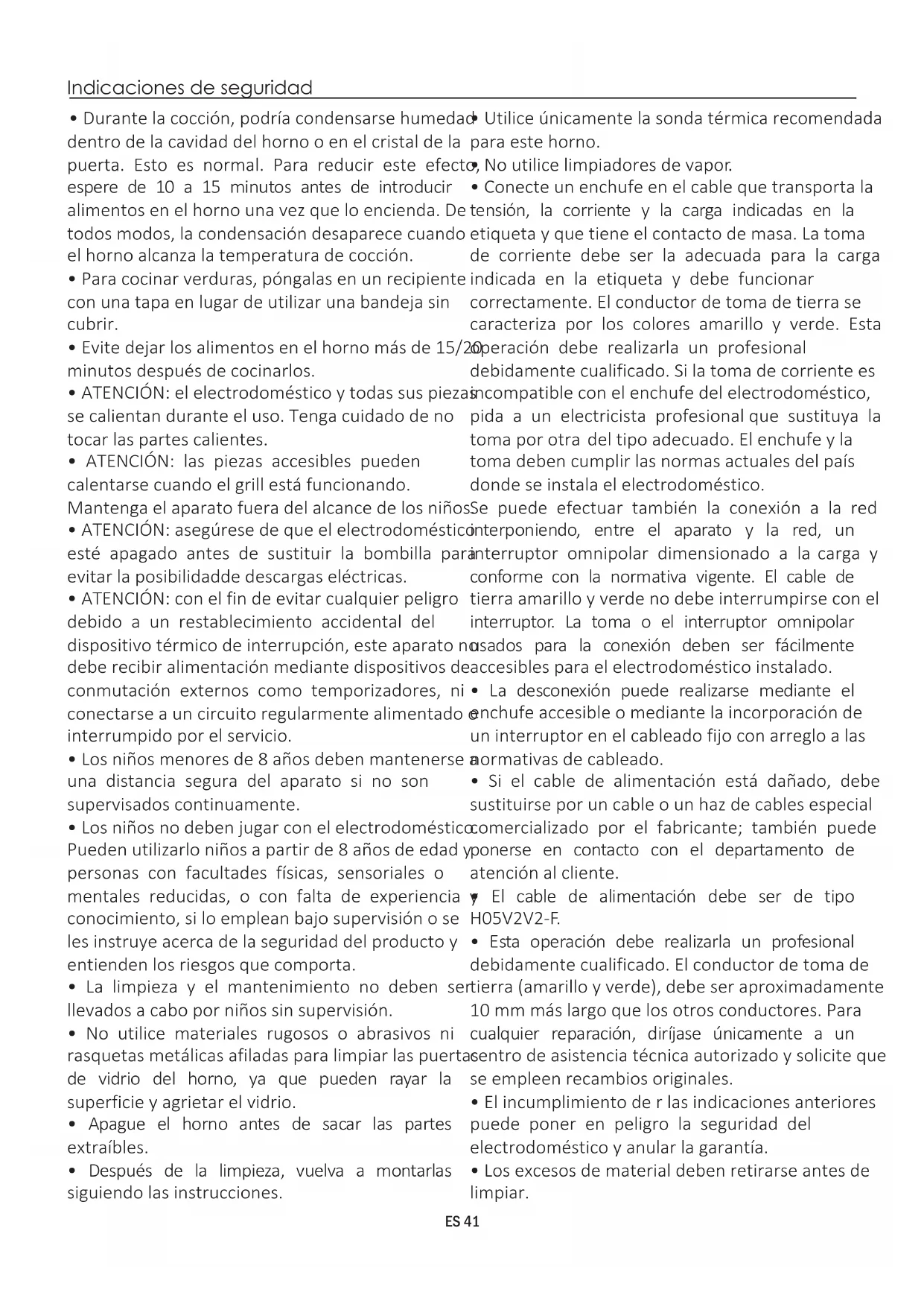 - Los excesos de material deben retirarse antes de limpiar. ES 41• Una interrupción prolongada de la corriente durante una fase de cocción puede causar una avería en el monitor. Póngase en contacto con el servicio de atención al cliente si esto ocurre.