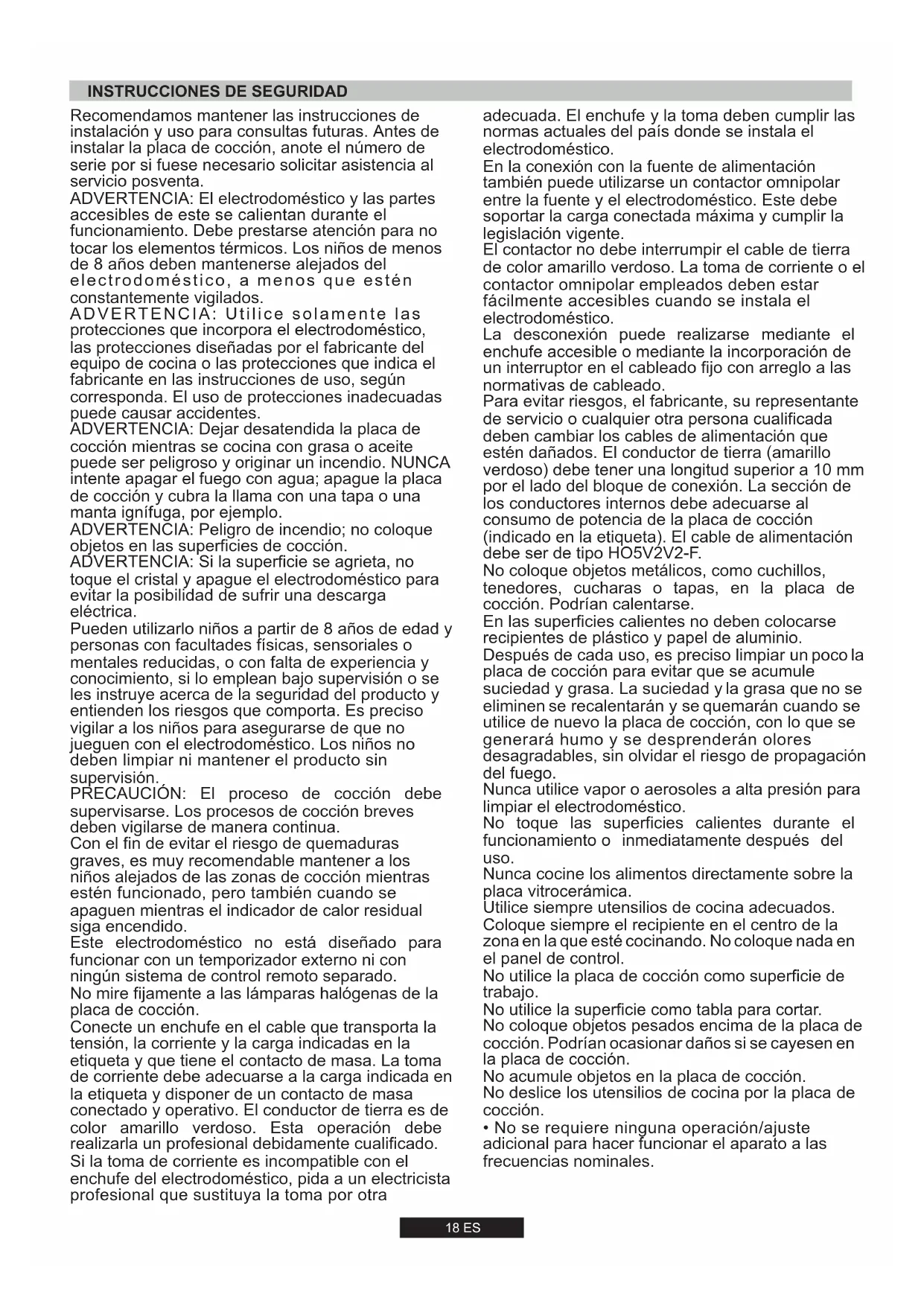 7,7 kW734 l/h560 g/h -18 ES Recomendamos mantener las instrucciones de instalación y uso para consultas futuras. Antes de instalar la placa de cocción, anote el número de serie por si fuese necesario solicitar asistencia al servicio posventa. ADVERTENCIA: El electrodoméstico y las partes accesibles de este se calientan durante el funcionamiento. Debe prestarse atención para no tocar los elementos térmicos. Los niños de menos de 8 años deben mantenerse alejados del electrodoméstico, a menos que estén constantemente vigilados. ADVERTENCIA: Utilice solamente las protecciones que incorpora el electrodoméstico, las protecciones diseñadas por el fabricante del equipo de cocina o las protecciones que indica el fabricante en las instrucciones de uso, según corresponda. El uso de protecciones inadecuadas puede causar accidentes. ADVERTENCIA: Dejar desatendida la placa de cocción mientras se cocina con grasa o aceite puede ser peligroso y originar un incendio. NUNCA intente apagar el fuego con agua; apague la placa de cocción y cubra la llama con una tapa o una manta ignífuga, por ejemplo. ADVERTENCIA: Peligro de incendio; no coloque objetos en las superficies de cocción. ADVERTENCIA: Si la superficie se agrieta, no toque el cristal y apague el electrodoméstico para evitar la posibilidad de sufrir una descarga eléctrica. Pueden utilizarlo niños a partir de 8 años de edad y personas con facultades físicas, sensoriales o mentales reducidas, o con falta de experiencia y conocimiento, si lo emplean bajo supervisión o se les instruye acerca de la seguridad del producto y entienden los riesgos que comporta. Es preciso vigilar a los niños para asegurarse de que no jueguen con el electrodoméstico. Los niños no deben limpiar ni mantener el producto sin supervisión. PRECAUCIÓN: El proceso de cocción debe supervisarse. Los procesos de cocción breves deben vigilarse de manera continua. Con el fin de evitar el riesgo de quemaduras graves, es muy recomendable mantener a los niños alejados de las zonas de cocción mientras estén funcionado, pero también cuando se apaguen mientras el indicador de calor residual siga encendido. Este electrodoméstico no está diseñado para funcionar con un temporizador externo ni con ningún sistema de control remoto separado. No mire fijamente a las lámparas halógenas de la placa de cocción. Conecte un enchufe en el cable que transporta la tensión, la corriente y la carga indicadas en la etiqueta y que tiene el contacto de masa. La toma de corriente debe adecuarse a la carga indicada en la etiqueta y disponer de un contacto de masa conectado y operativo. El conductor de tierra es de color amarillo verdoso. Esta operación debe realizarla un profesional debidamente cualificado. Si la toma de corriente es incompatible con el enchufe del electrodoméstico, pida a un electricista profesional que sustituya la toma por otra