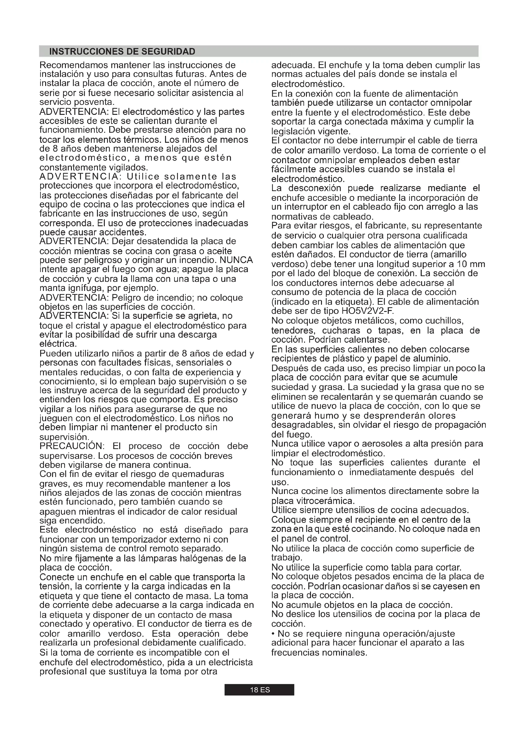 adecuada. El enchufe y la toma deben cumplir las normas actuales del país donde se instala el electrodoméstico. En la conexión con la fuente de alimentación también puede utilizarse un contactor omnipolar entre la fuente y el electrodoméstico. Este debe soportar la carga conectada máxima y cumplir la legislación vigente. El contactor no debe interrumpir el cable de tierra de color amarillo verdoso. La toma de corriente o el contactor omnipolar empleados deben estar fácilmente accesibles cuando se instala el electrodoméstico. La desconexión puede realizarse mediante el enchufe accesible o mediante la incorporación de un interruptor en el cableado fijo con arreglo a las normativas de cableado. Para evitar riesgos, el fabricante, su representante de servicio o cualquier otra persona cualificada deben cambiar los cables de alimentación que estén dañados. El conductor de tierra (amarillo verdoso) debe tener una longitud superior a 10 mm por el lado del bloque de conexión. La sección de los conductores internos debe adecuarse al consumo de potencia de la placa de cocción (indicado en la etiqueta). El cable de alimentación debe ser de tipo HO5V2V2-F. No coloque objetos metálicos, como cuchillos, tenedores, cucharas o tapas, en la placa de cocción. Podrían calentarse. En las superficies calientes no deben colocarse recipientes de plástico y papel de aluminio. Después de cada uso, es preciso limpiar un poco la placa de cocción para evitar que se acumule suciedad y grasa. La suciedad y la grasa que no se eliminen se recalentarán y se quemarán cuando se utilice de nuevo la placa de cocción, con lo que se generará humo y se desprenderán olores desagradables, sin olvidar el riesgo de propagación del fuego. Nunca utilice vapor o aerosoles a alta presión para limpiar el electrodoméstico. No toque las superficies calientes durante el funcionamiento o inmediatamente después del uso. Nunca cocine los alimentos directamente sobre la placa vitrocerámica. Utilice siempre utensilios de cocina adecuados. Coloque siempre el recipiente en el centro de la zona en la que esté cocinando. No coloque nada en el panel de control. No utilice la placa de cocción como superficie de trabajo. No utilice la superficie como tabla para cortar. No coloque objetos pesados encima de la placa de cocción. Podrían ocasionar daños si se cayesen en la placa de cocción. No acumule objetos en la placa de cocción. No deslice los utensilios de cocina por la placa de cocción.