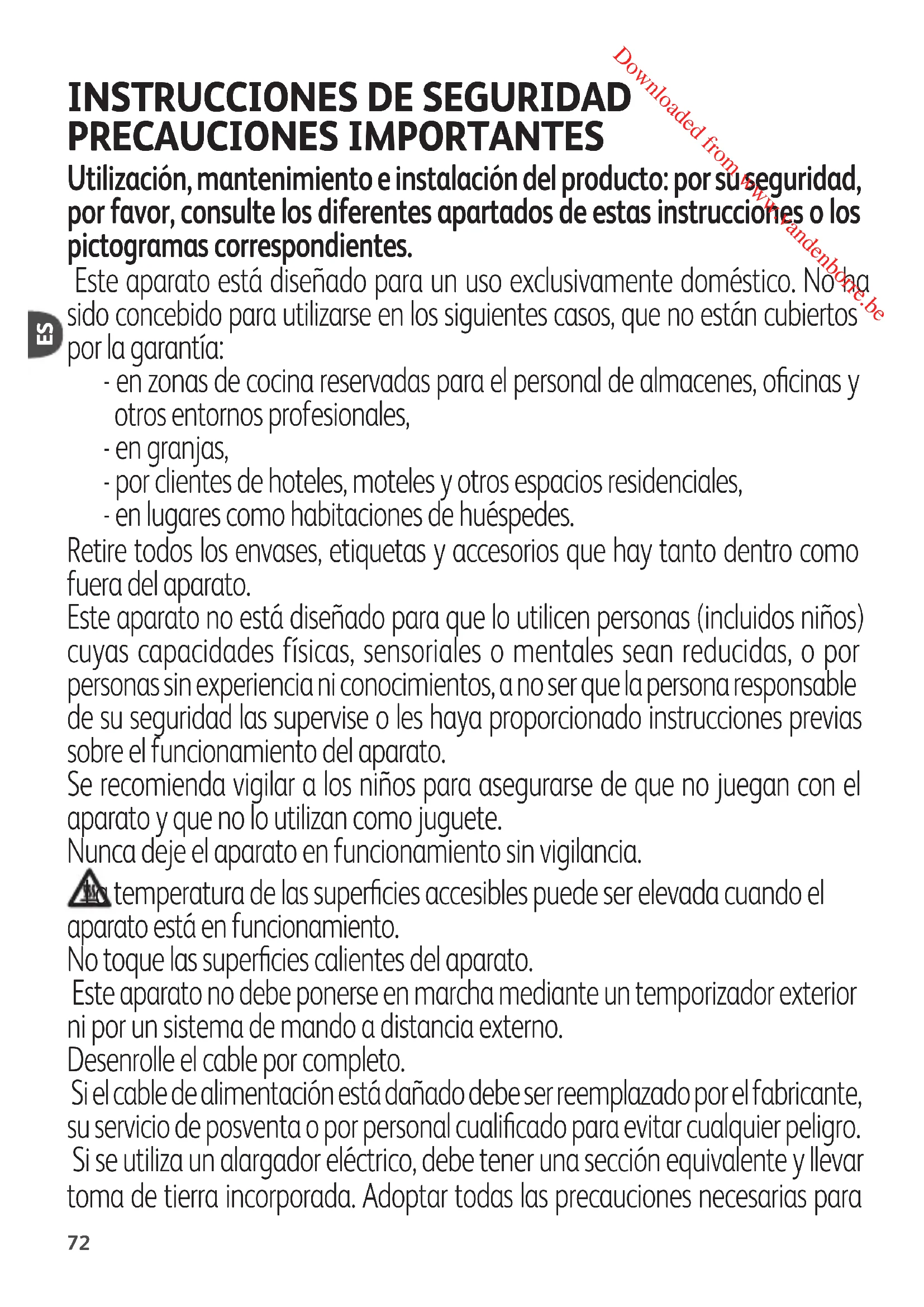 PRECAUCIONES IMPORTANTES Utilización, mantenimiento e instalación del producto: por su seguridad, por favor, consulte los diferentes apartados de estas instrucciones o los pictogramas correspondientes. Este aparato está diseñado para un uso exclusivamente doméstico. No ha sido concebido para utilizarse en los siguientes casos, que no están cubiertos por la garantía: - en zonas de cocina reservadas para el personal de almacenes, oficinas y otros entornos profesionales, - en granjas, - por clientes de hoteles, moteles y otros espacios residenciales, - en lugares como habitaciones de huéspedes. Retire todos los envases, etiquetas y accesorios que hay tanto dentro como fuera del aparato. Este aparato no está diseñado para que lo utilicen personas (incluidos niños) cuyas capacidades físicas, sensoriales o mentales sean reducidas, o por personas sin experiencia ni conocimientos, a no ser que la persona responsable de su seguridad las supervise o les haya proporcionado instrucciones previas sobre el funcionamiento del aparato. Se recomienda vigilar a los niños para asegurarse de que no juegan con el aparato y que no lo utilizan como juguete. Nunca deje el aparato en funcionamiento sin vigilancia. La temperatura de las superficies accesibles puede ser elevada cuando el aparato está en funcionamiento. No toque las superficies calientes del aparato. Este aparato no debe ponerse en marcha mediante un temporizador exterior ni por un sistema de mando a distancia externo. Desenrolle el cable por completo. Si el cable de alimentación está dañado debe ser reemplazado por el fabricante, su servicio de posventa o por personal cualificado para evitar cualquier peligro. Si se utiliza un alargador eléctrico, debe tener una sección equivalente y llevar toma de tierra incorporada. Adoptar todas las precauciones necesarias para Downloaded from www.vandenborre.be73