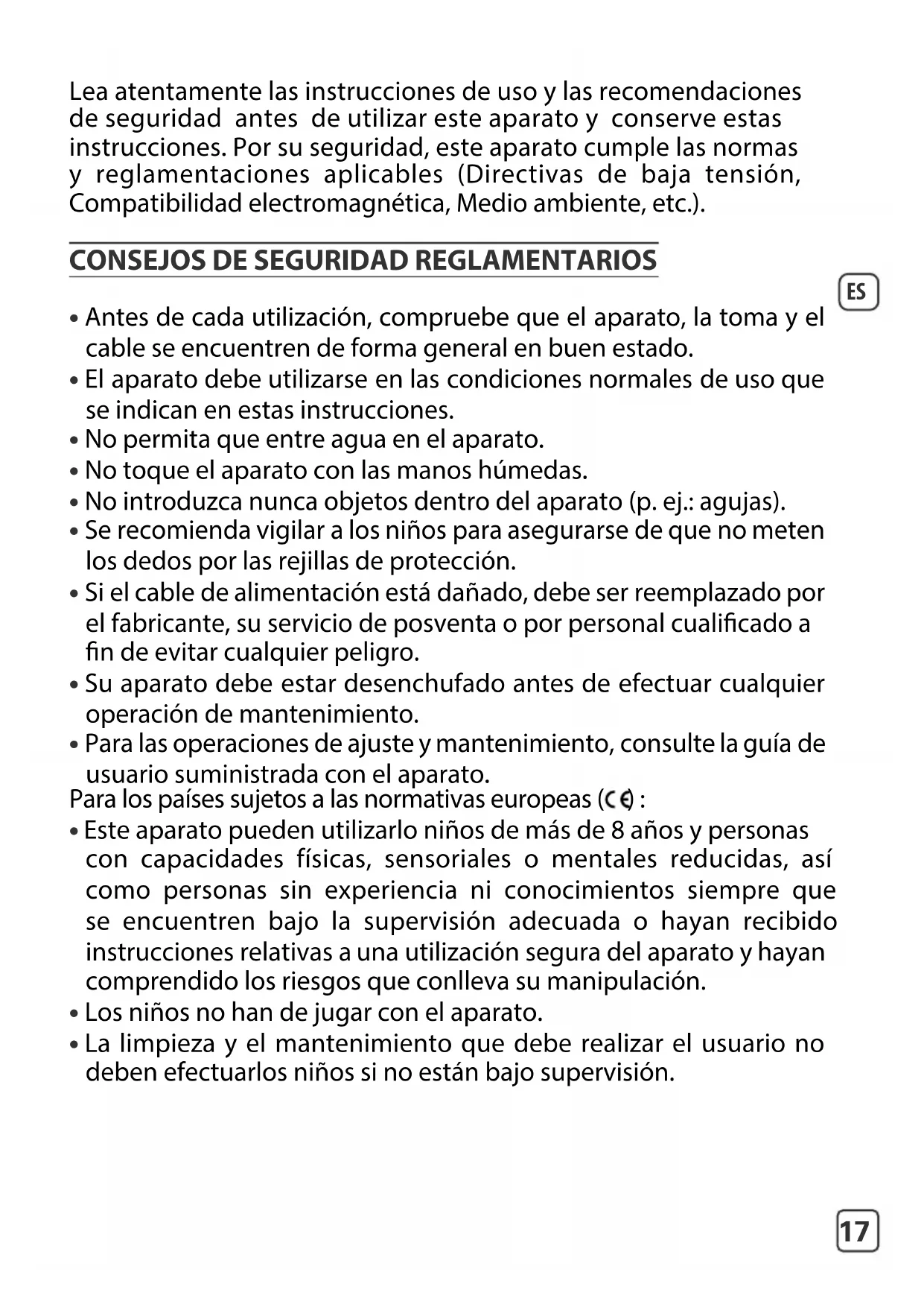 Lea atentamente las instrucciones de uso y las recomendaciones de seguridad antes de utilizar este aparato y conserve estas instrucciones. Por su seguridad, este aparato cumple las normas y reglamentaciones aplicables (Directivas de baja tensión, Compatibilidad electromagnética, Medio ambiente, etc.).
