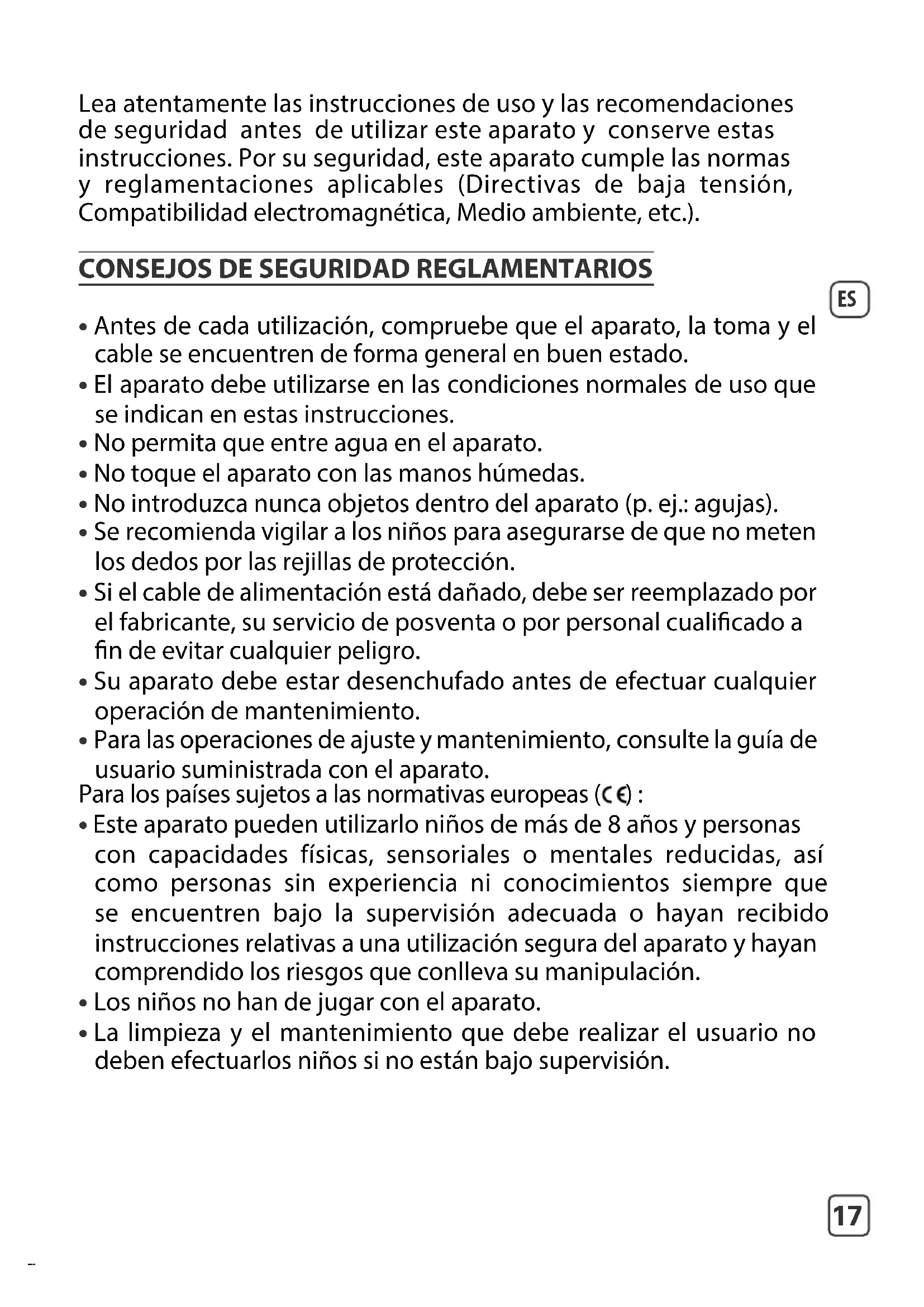 Lea atentamente las instrucciones de uso y las recomendaciones de seguridad antes de utilizar este aparato y conserve estas instrucciones. Por su seguridad, este aparato cumple las normas y reglamentaciones aplicables (Directivas de baja tensión, Compatibilidad electromagnética, Medio ambiente, etc.).