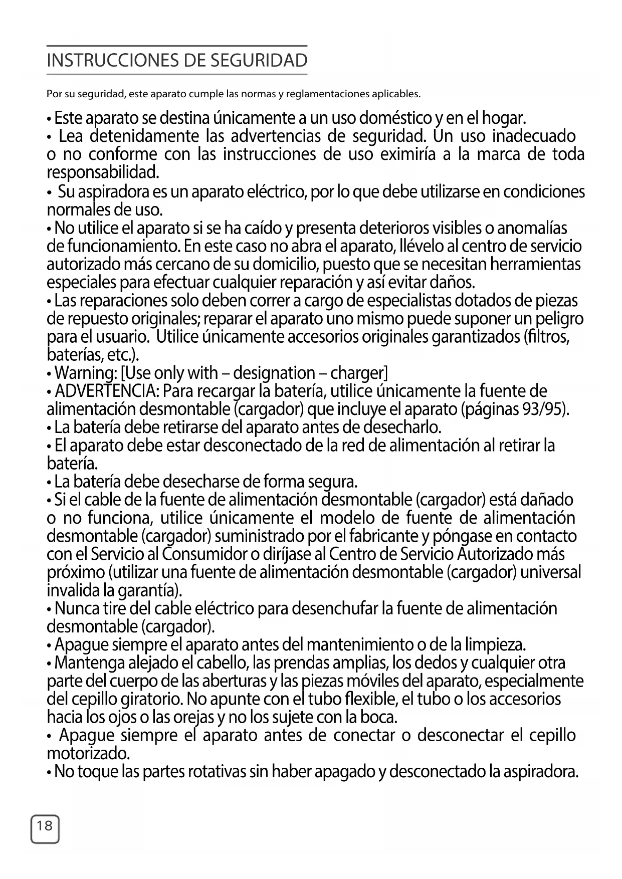 - Compruebe que la tensión de alimentación (voltaje) que gura en la placa indicadora del cargador de la aspiradora coincide con la tensión de su red eléctrica. Cualquier error de conexión puede provocar daños irreversibles en el producto y anulará la garantía.