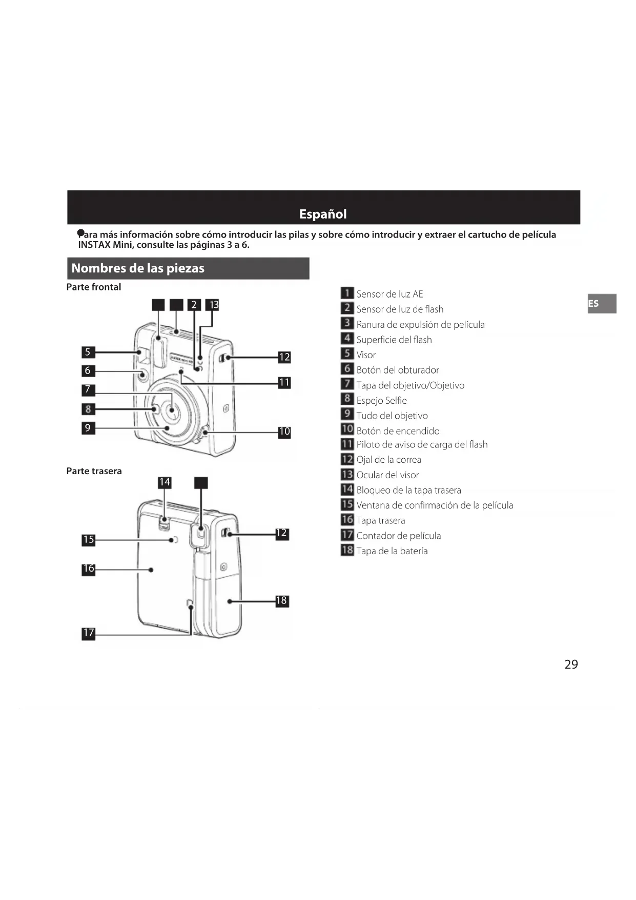 Para más información sobre cómo introducir las pilas y sobre cómo introducir y extraer el cartucho de película INSTAX Mini, consulte las páginas 3 a 6. CPL24B703-300_instaxmini40(BO-24)_US.indb 29 11/26/2020 11:49:44 AM30