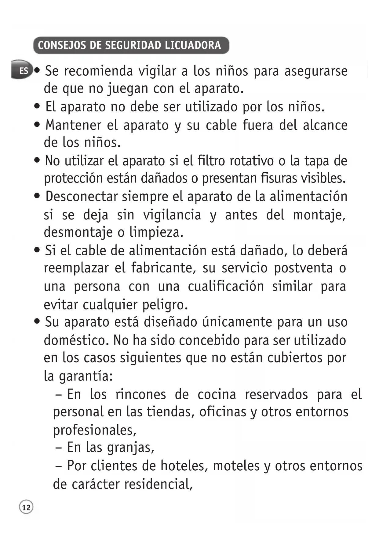 - Este aparato está exclusivamente destinado a un uso doméstico. El fabricante declina cualquier responsabilidad y se reserva el derecho de anular la garantía en caso de utilización comercial o inadecuada, o de no respeto de las instrucciones del modo de empleo.