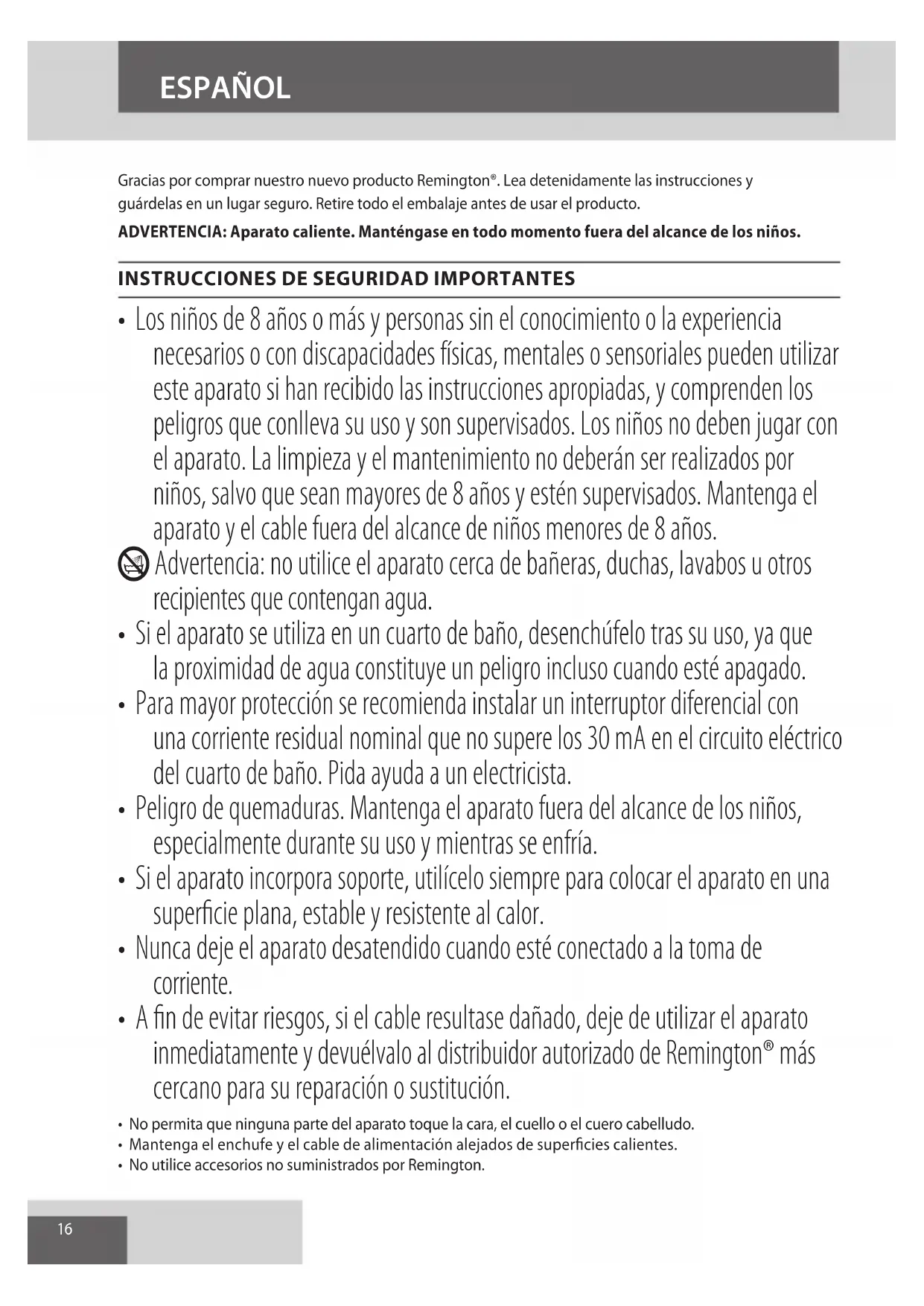 - No utilice accesorios no suministrados por Remington. ESPAÑOL17 ESPAÑOL